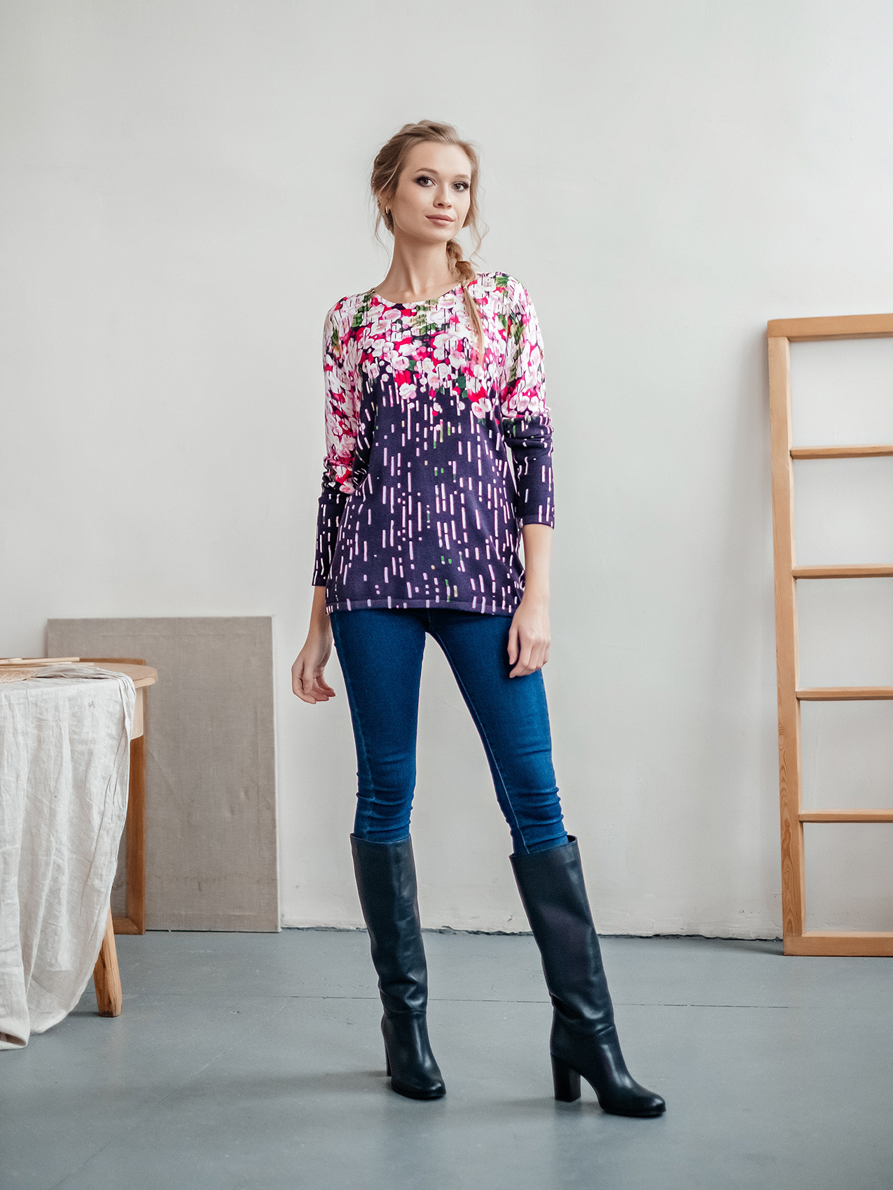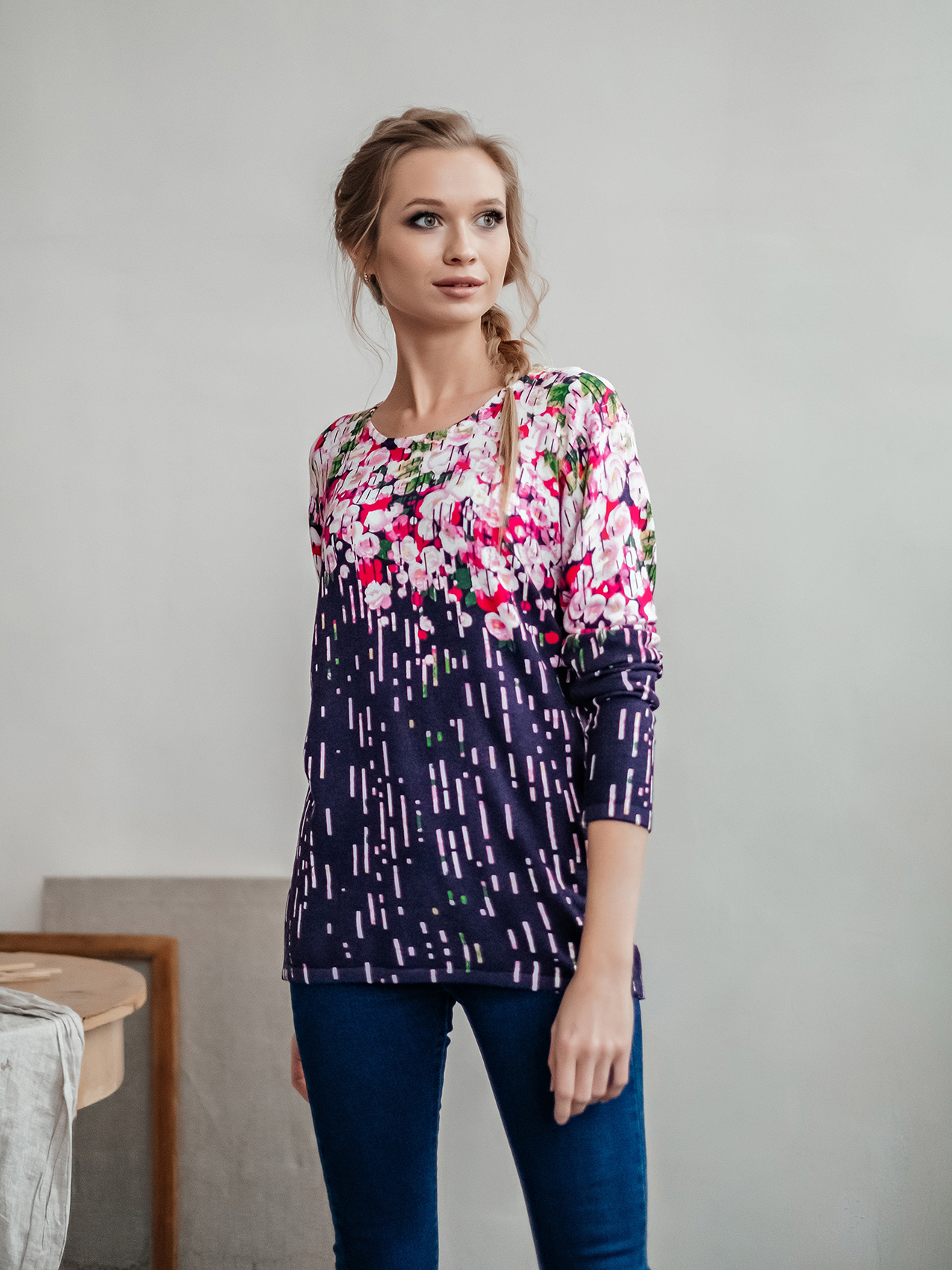 Позвольте себе быть яркой в этом джемпере с цветочным принтом! Джемпер свободного покроя, круглый вырез горловины, втачные рукава полной длины. Материал из вискозной смеси приятен к телу и обеспечивает комфорт.