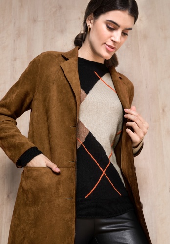 Джемпер свободного покроя великолепно дополнит ваш осенний образ. Круглый вырез горловины, рукава полной длины со спущенным плечом. Новая интерпретация узора с ромбами притягивает восхищенные взгляды. Смесовый материал с вискозой и шерстью в составе приятен к телу и обеспечивает сохранение тепла.