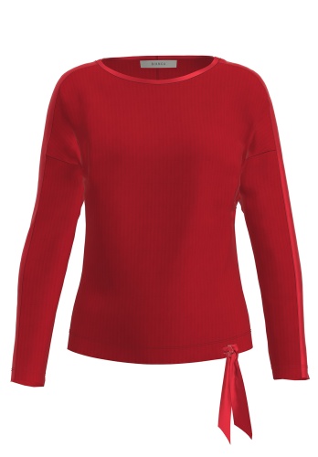 Джемпер в цвете чили - вещь для яркого образа! Прямой покрой. Круглый вырез горловины и рукава полной длины со спущенным плечом отделаны лентой, придающей ненавязчивый блеск. Низ изделия оформлен лентой-бантом. Приятный к телу эластичный материал комфортен в ношении.