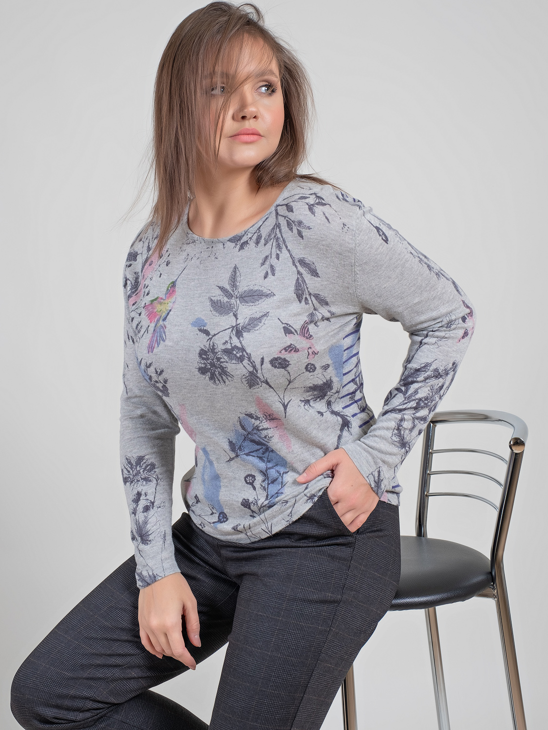 На сайте указаны российские размеры. Ткань: комфортный телу смесовый материал. В составе: 60% вискоза, 40% хлопок. Крой: слегка приталенный джемпер с длинным рукавом и круглым вырезом. Прикрывает зону живота, подчеркивает достоинства фигуры. Легкий, но при этом теплый трикотаж с хлопком и вискозой дарит комфорт. Отделка: оригинальный принт в природном стиле освежает образ и приближает наступление тепла даже в разгар холодов. Сочетайте с брюками, джинсами и юбками из ассортимента Stern.