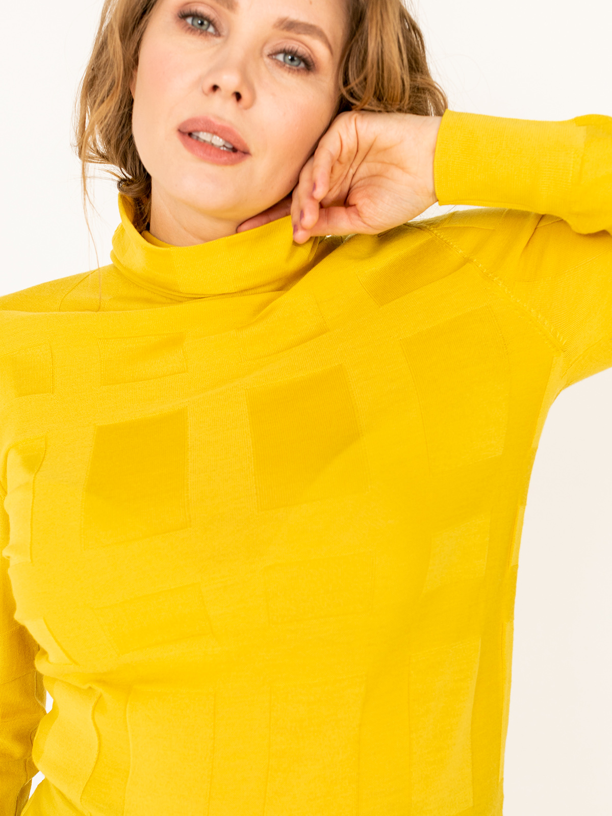 Однотонная водолазка – базовый элемент гардероба любой женщины. Геометрическая фактура задает динамику образу. Материал из натуральной шерсти. Втачной рукав полной длины, ворот-хомут.