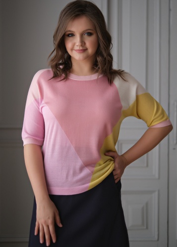 На сайте указаны Российские размеры. Ткань: смесовая ткань средней плотности. В составе: 23% шерсть, 32% тенсел, 45% акрил. Крой: слегка приталенный джемпер с коротким рукавом и круглым вырезом в стиле color blocking. Несмотря на то, что яркая геометрия принта приковывает сотни взглядов, она способна скрыть нюансы фигуры, о которых необязательно знать всем. Короткий комфортный рукав в спортивном стиле – выбор активных женщин, успевающих сделать 100 дел на дню. Отделка: оттенки ягодного зефира и лимонного пудинга не оставляют равнодушных. Рукава, низ и горловина отделаны резинкой, которая не давит, но обеспечивает деликатное прилегание к телу. Создайте нежный образ со свободными светлыми брюками или юбкой из коллекции Stern.