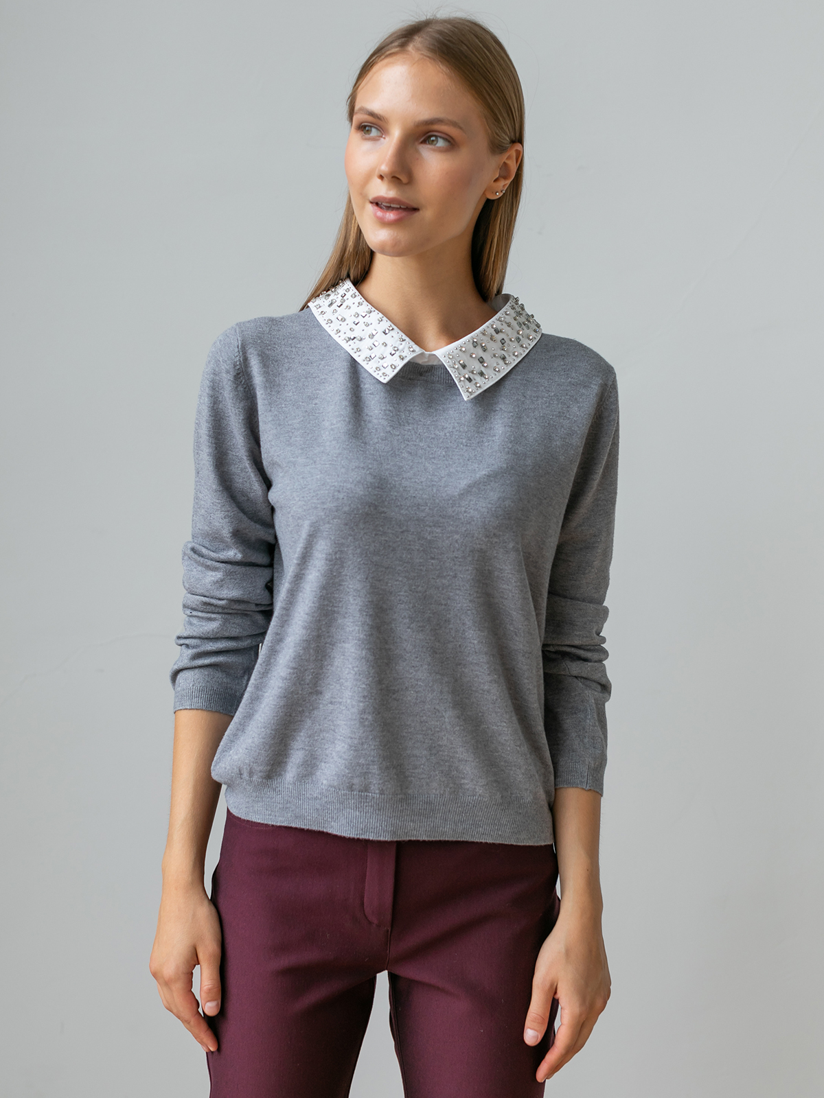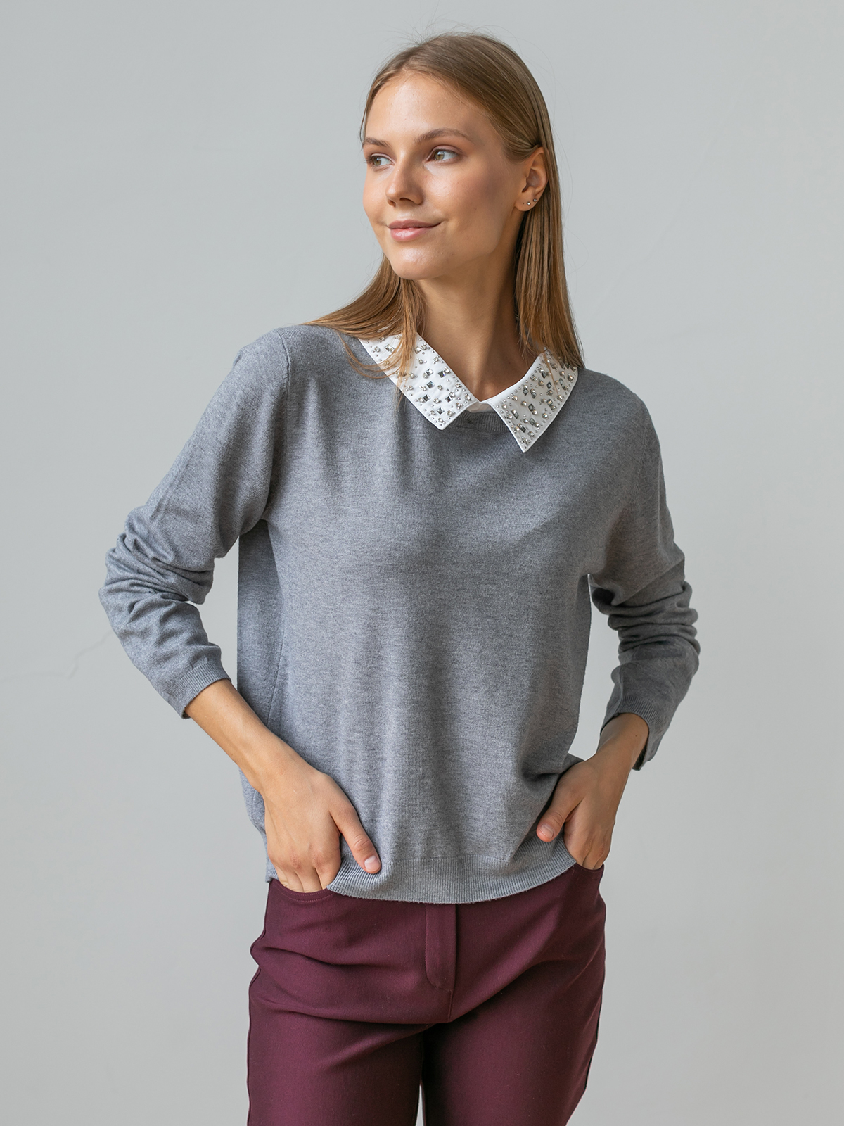 Джемпер с имитацией модели-двойки – элегантный вариант верха для образа в деловом стиле. Свободный крой подходит для фигур разного типа. Длинный втачной рукав с эластичной манжетой. Функциональный акцент в виде замка-молнии на спинке. Белый отложной воротничок декорирован стразами. Джемпер хорошо сочетается как с юбкой, так и с брюками.