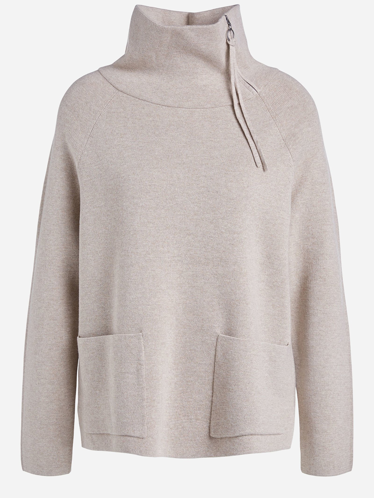 Бежевый джемпер с воротником-стойкой на молнии. Прямой покрой, разрезы сбоку, удлиненная спинка изделия. Два накладных кармана спереди. Приятный трикотаж из смесового хлопка приятен к телу и обеспечивает комфортное ношение. Длина 60 см для размера 42. Рост модели 178 см, ее размер – 42 (российский).