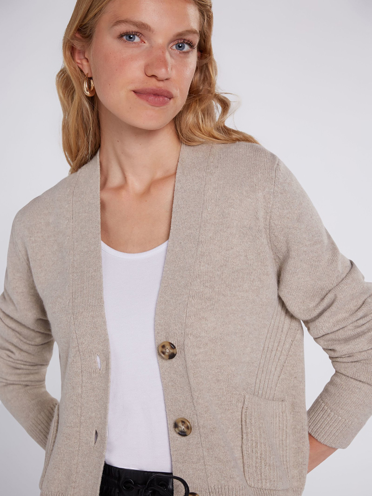 Укороченный кардиган с деталями в рубчик. Женственный V-образный вырез, планка с тремя пуговицами. Два практичных накладных кармана. Длинные втачные рукава. Длина 50 см для размера 42. Рост модели 178 см, ее размер – 42 (российский).