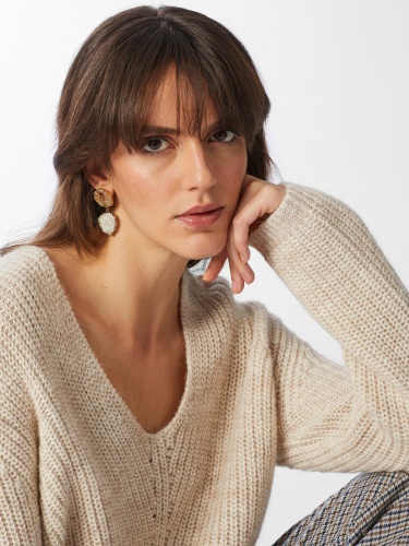 Пуловер крупной вязки с V-образный вырез горловины. Базовая модель прекрасно сочетается с различными образами. Свободный силуэт, спущенная линия плеча создают расслабленный образ. В составе материала шерсть альпаки, что делает пуловер приятным к телу.