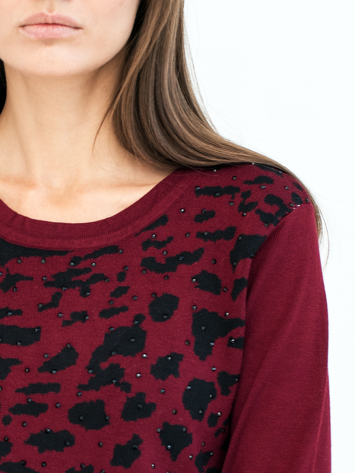 На сайте указаны Российские размеры. Анималистичный принт – бесспорный тренд этого сезона! Джемпер в насыщенном бордовом оттенке с леопардовым узором украшен стразами. Овальный вырез горловины подчеркивает изящество линии шеи. Прямой крой прекрасно подходит к разному типу фигуры. Джемпер хорошо сочетается как с брюками, так и с юбкой.