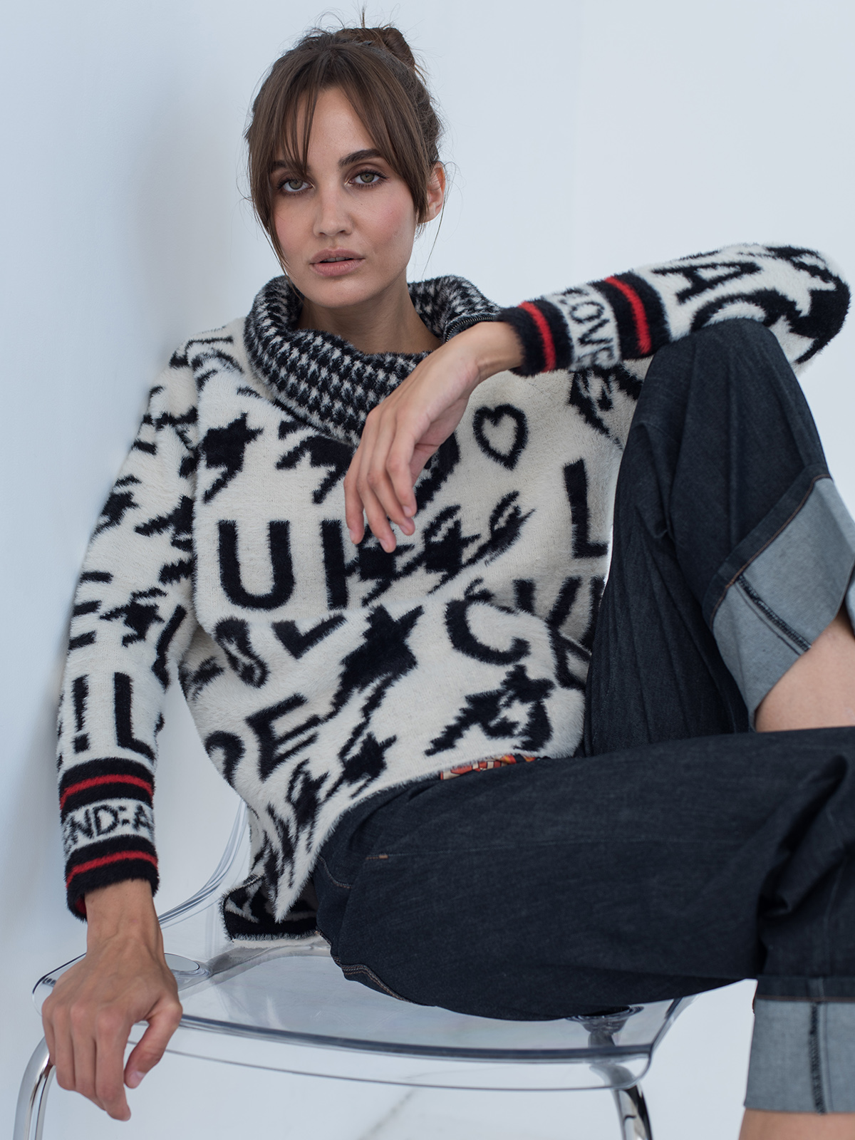 Джемпер с высоким воротником на молнии выполнен в черно-белой гамме. Актуальный илуэт оверсайз. Пуловер хорошо сохраняет тепло и подходит для создания трендовых образов в повседневном городском стиле.