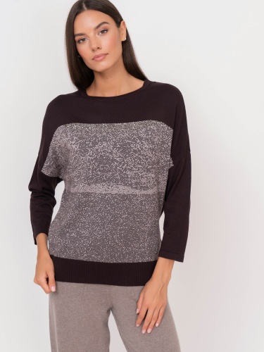 Джемпер с нитью люрекса подойдет для повседневного городского образа. Рукав 3/4, спущенная линия плеч, круглый вырез горловины.