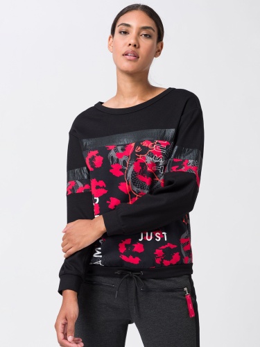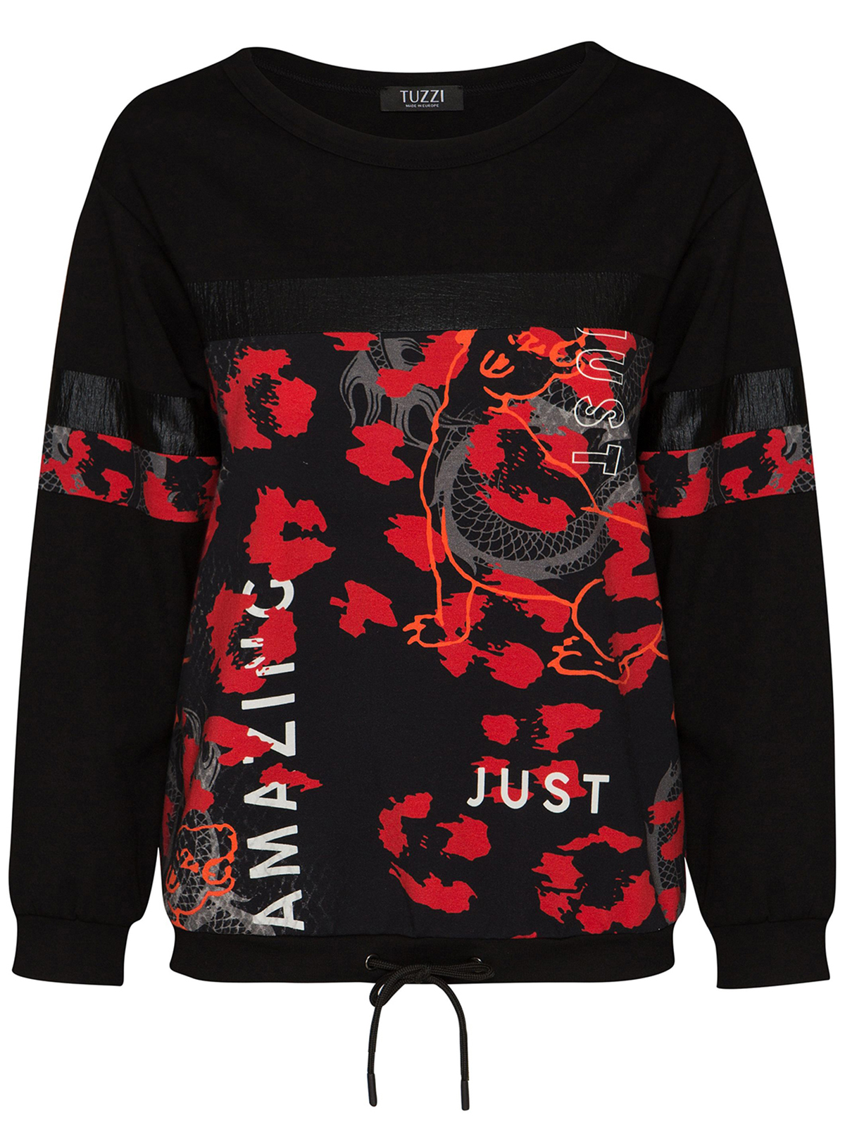 Черный свитшот с ярким принтом. Широкий овальный вырез горловины, длинный втачной рукав, спущенная линия плеч. По низу эластичный пояс с кулиской.
