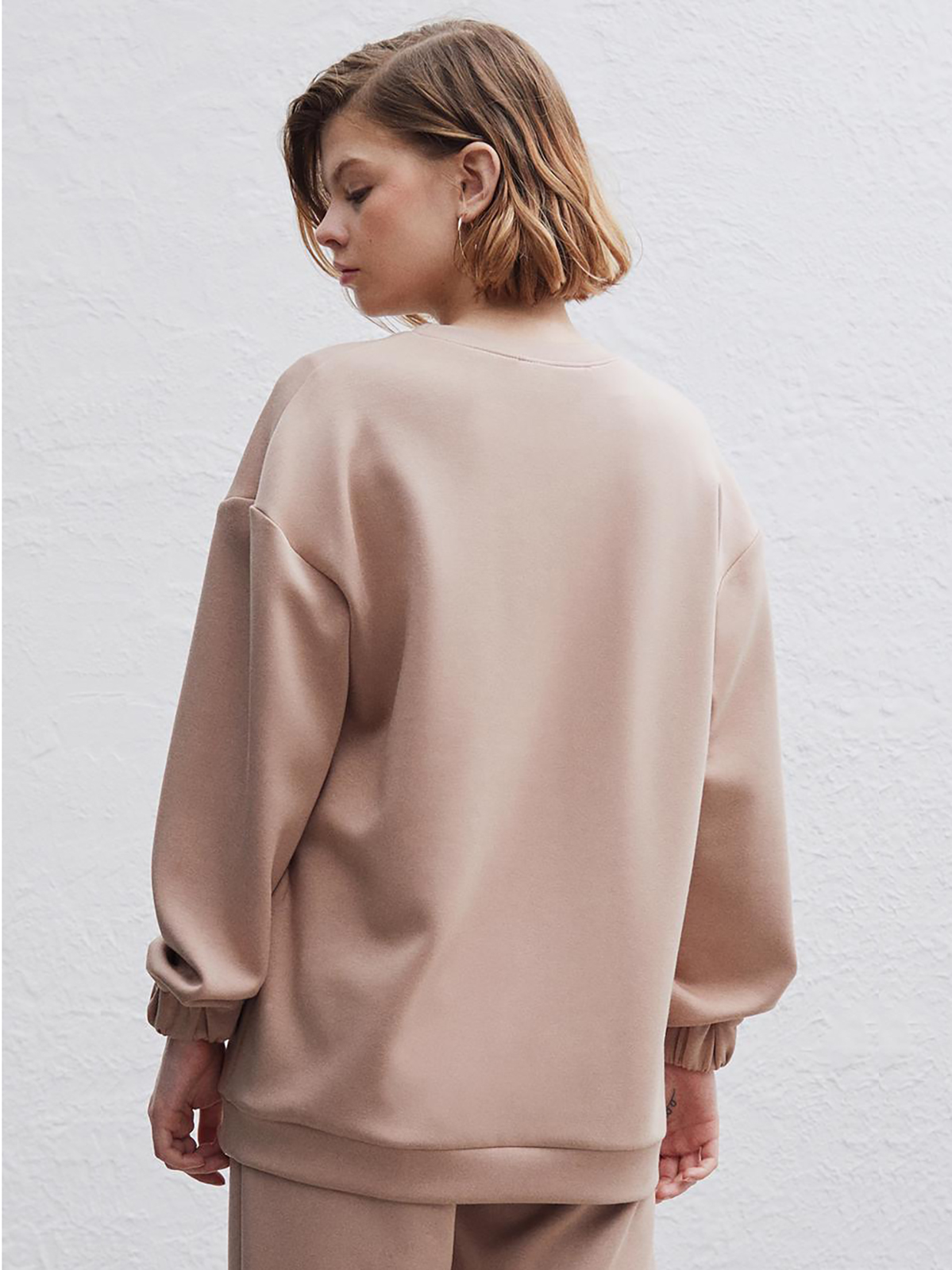 Свитшот прямого кроя с накладным карманом, стилизованным под поясную сумку. Руглый вырез горловины, длинные рукава с манжетами, спущенная линия плеч.