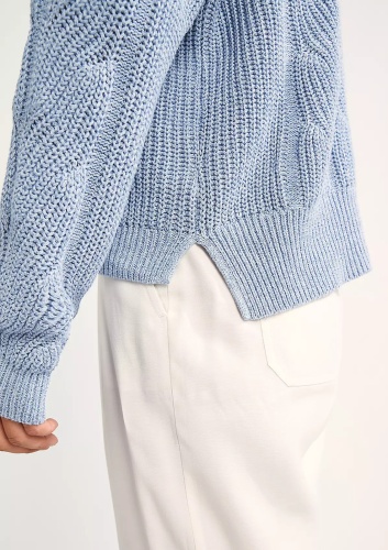 Однотонный джемпер крупной вязки. Материал из натурального хлопка. Свободный силуэт, спущенная линия плеч. Круглый вырез горловины, длинные втачные рукава.
