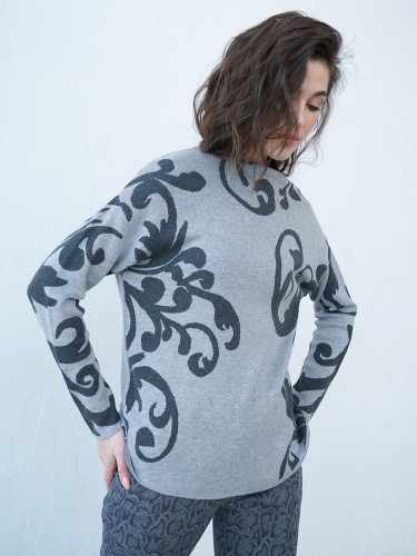 Джемпер прямого кроя с ажурным узором. Вырез горловины лодочка, втачные рукава, спущенная линия плеча.