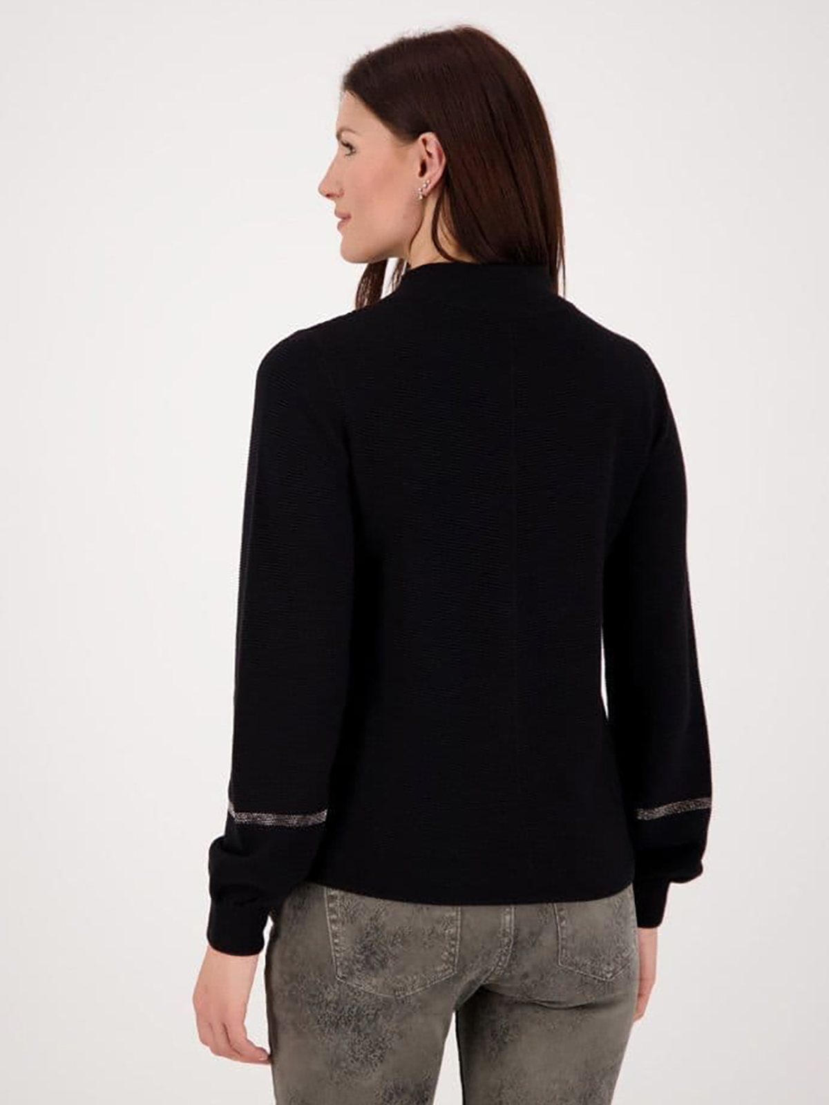 Однотонный джемпер в рубчик со швом по центру. Прямой крой, свободный силуэт, широкий воротник-стойка. Длинные втачные рукава с манжетами. В качестве декора серебристая лента на рукаве.