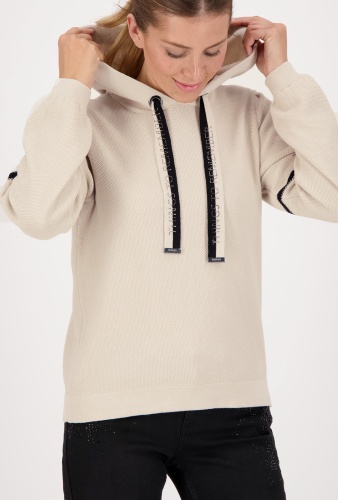Однотонная толстовка прямого кроя в базовом бежевом оттенке. Капюшон с кулиской и контрастным шнурком. Длинные втачные рукава с трикотажными эластичными манжетами. Акцентные детали в виде контрастных полос на рукавах.