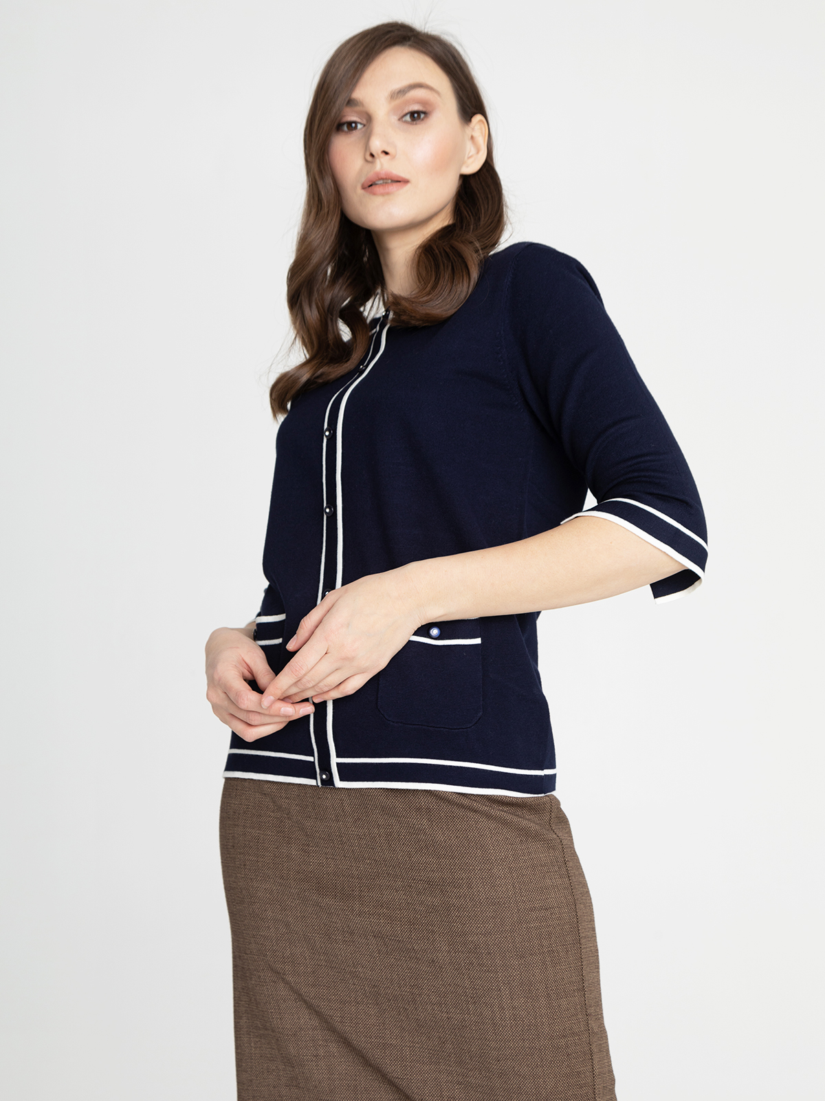 Элегантный темно-синий джемпер с контрастной отделкой по контуру изделия. Круглый вырез горловины, планка с пуговицами. Короткие втачные рукава, два накладных кармана спереди.