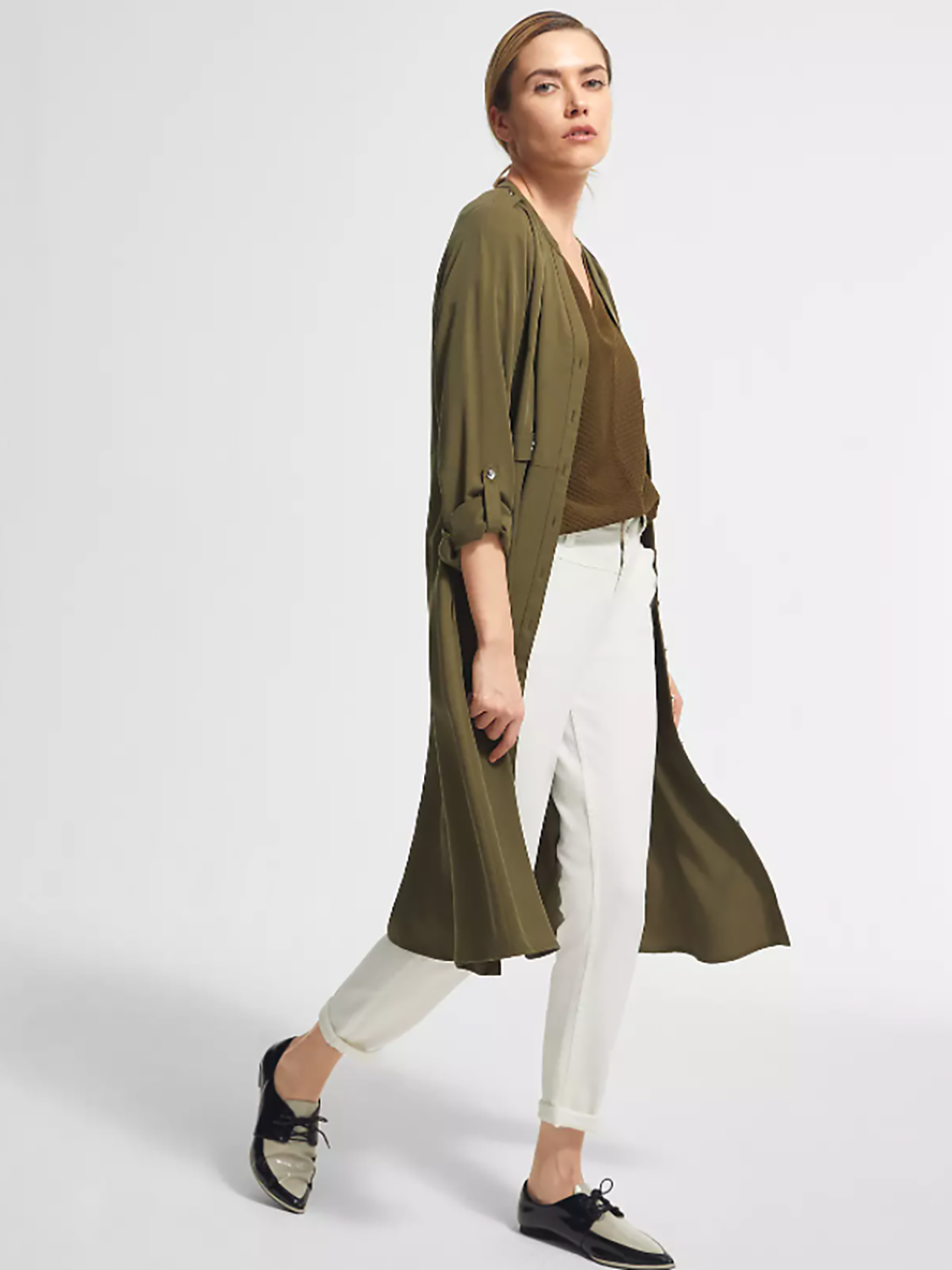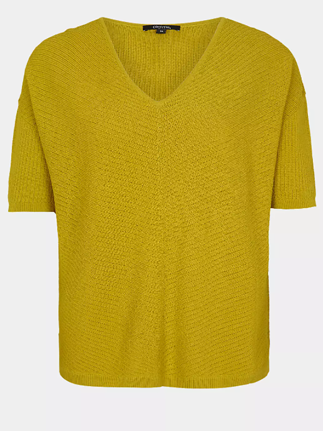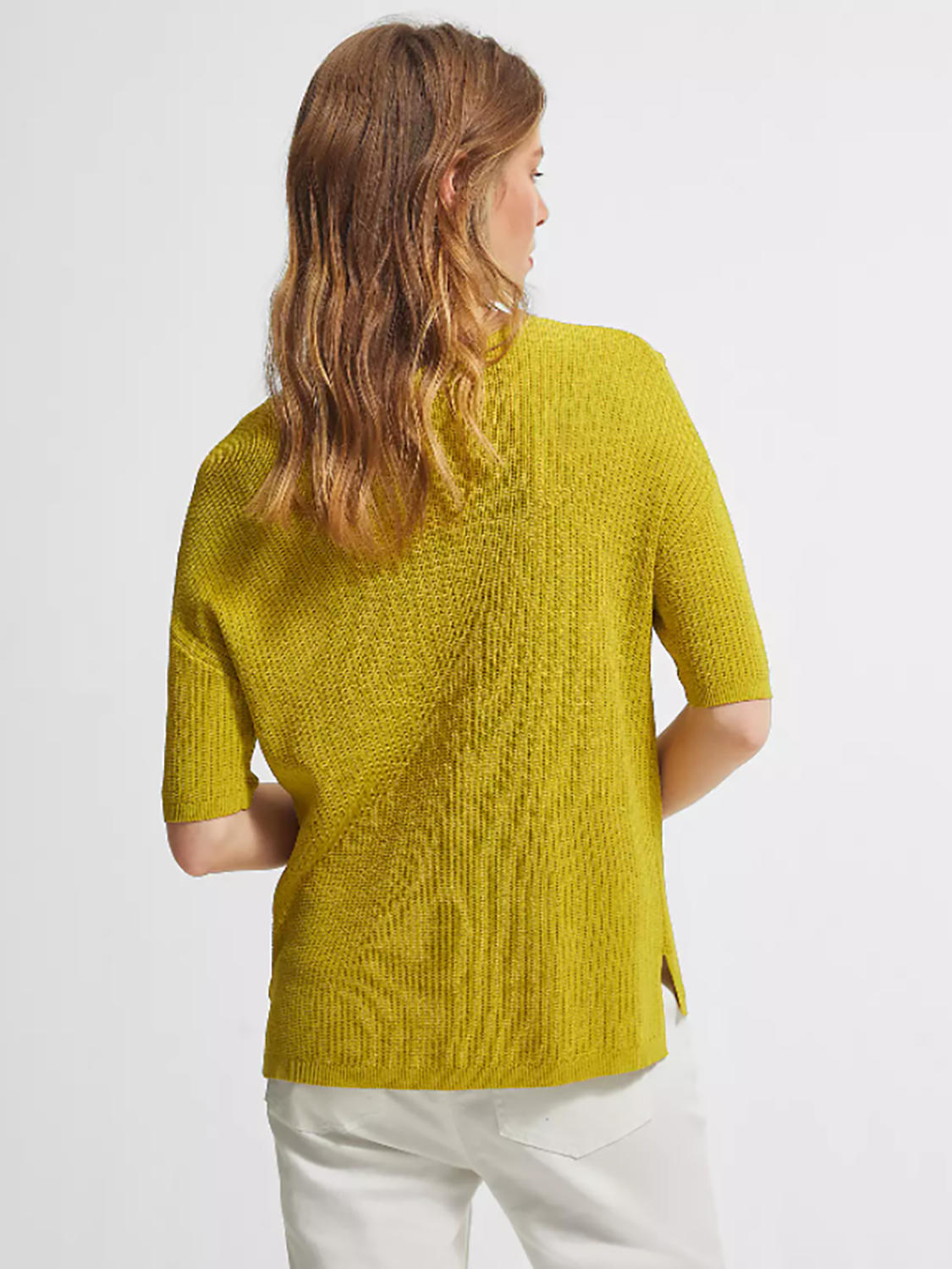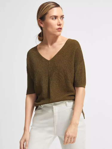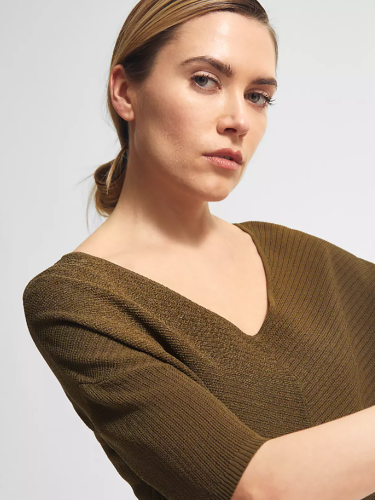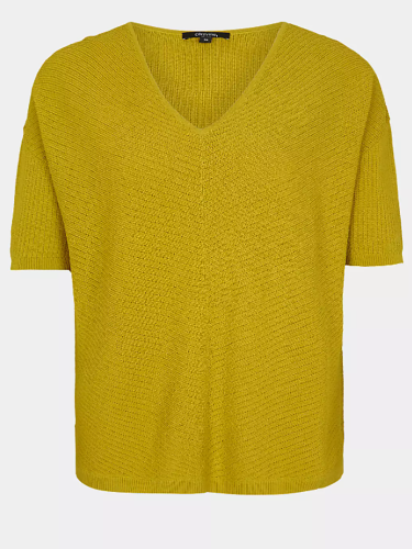 Однотонный джемпер мелкой вязки с глубоким V-образным вырезом горловины. Спущенная линия плеч, втачной рукав длиной до середины локтя. Свободный силуэт, невысокие вырезы по бокам.