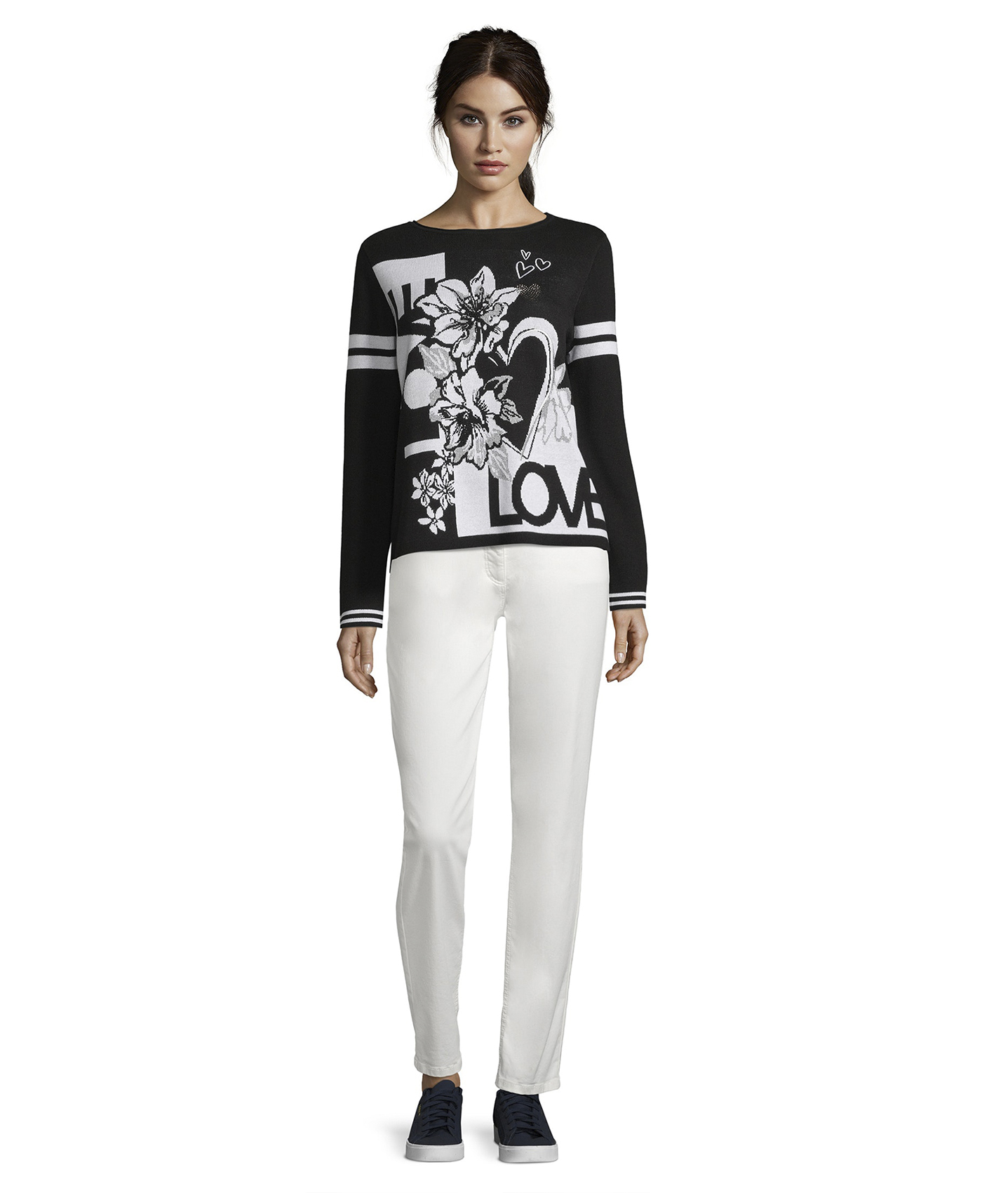 Необычное сочетание цветов, надписи и полоски, и все в одной вещи! Поэтому черно-белый дизайн совсем не выглядит скучно. Джемпер прямого покроя с длинными рукавами и вырезом горловины "лодочка". Материал из хлопково-вискозной смеси приятен к телу и обеспечивает комфорт. Этот джемпер - отличный выбор для прогулки прохладным летним вечером.