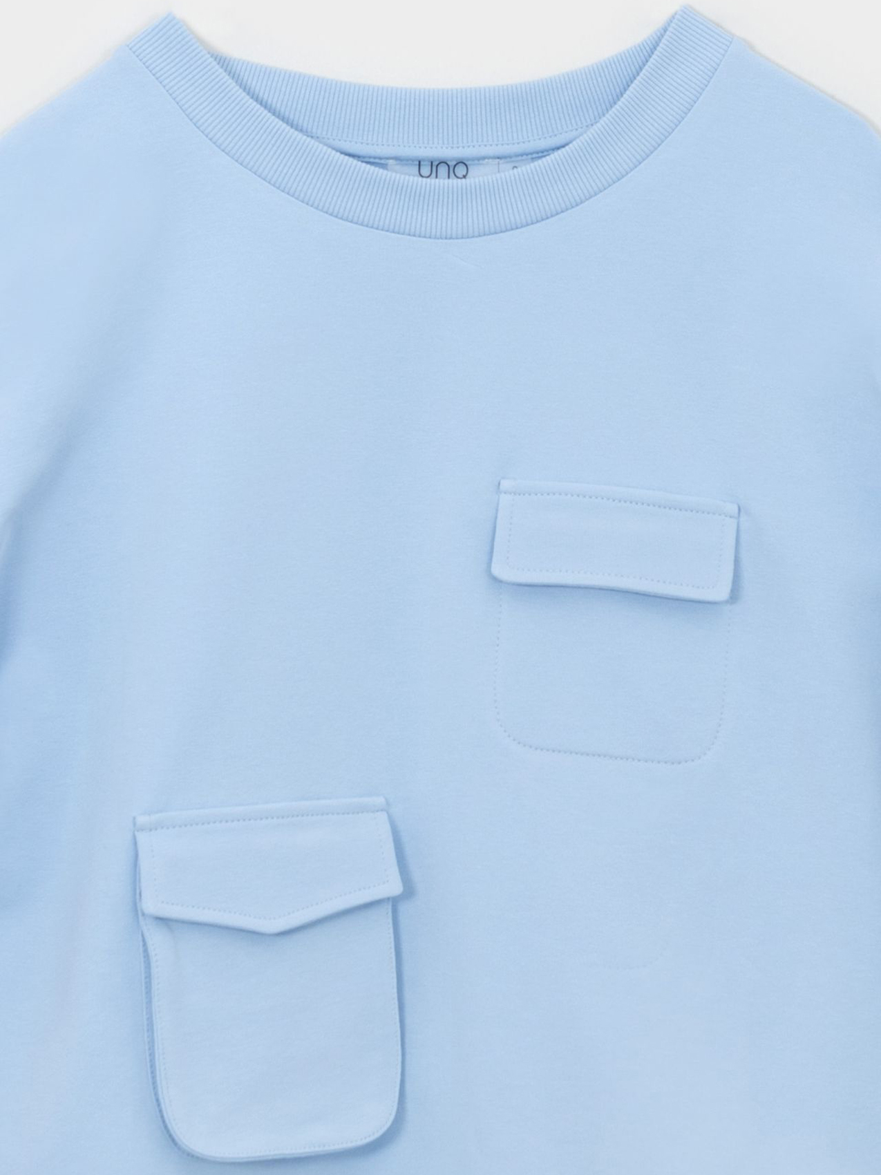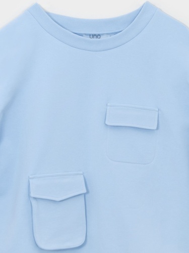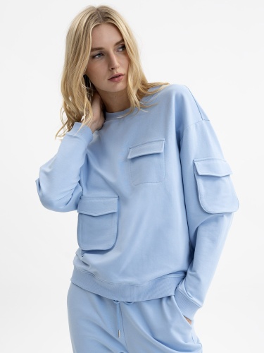Оригинальный однотонный свитшот с тремя ассиметричными накладными карманами. Втачной рукав полной длины со спущенной линией плеч. Круглый вырез горловины, эластичный пояс по низу изделия.