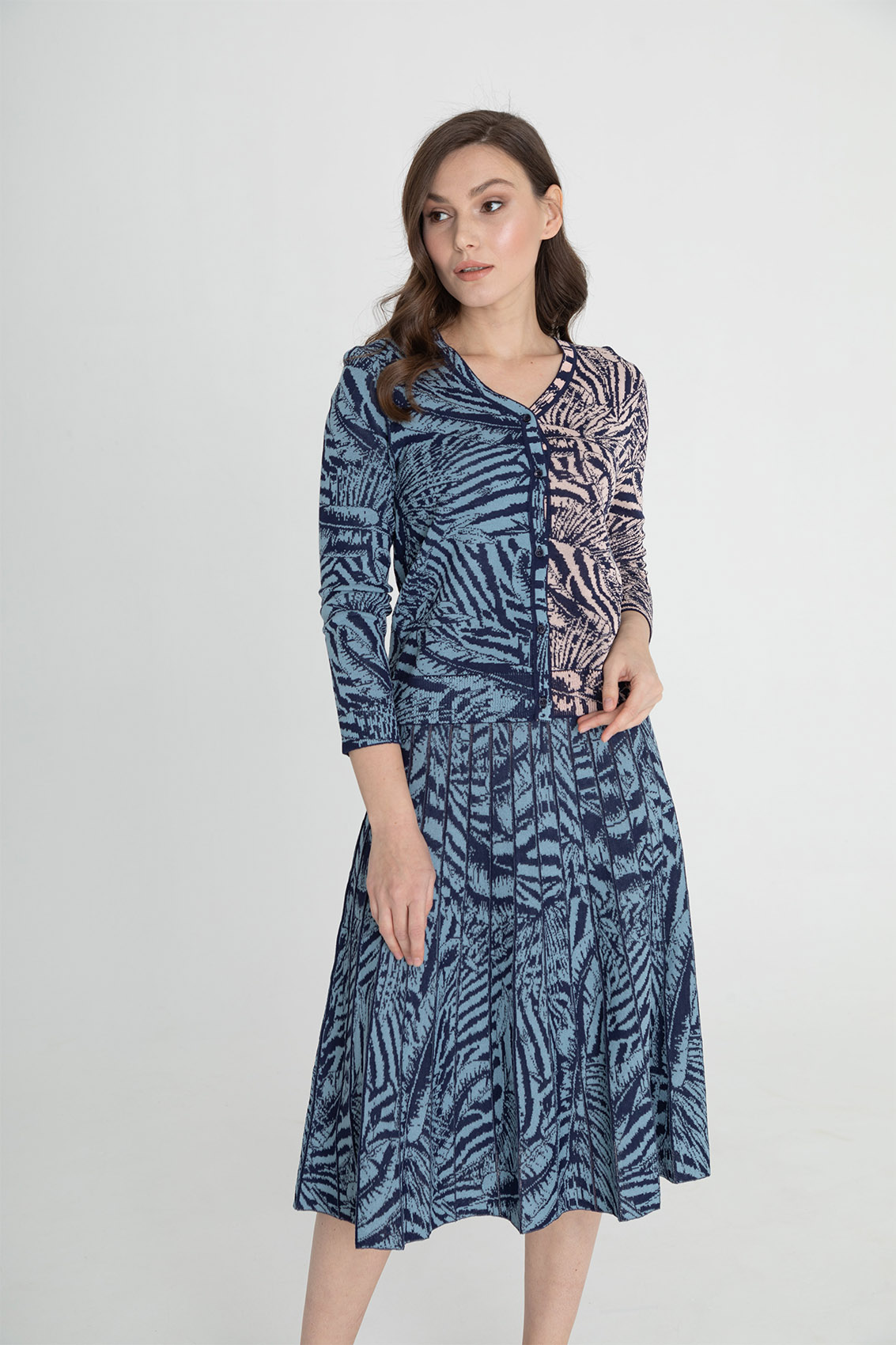 На сайте указаны российские размеры. Ткань: 89% вискоза, 11% нейлон. Крой: джемпер-кардиган вязаный на пуговицах и V-образным неглубоким вырезом. Красиво подчеркивает талию и линию шеи. Активный сложный принт позволяет скрыть недостатки фигуры и показать во всей красоте сильные ее стороны. Отделка: украшен фирменным металлическим шильдиком. В разделе юбок вы найдете юбку аналогичной расцветки, с которой можно составить полноценный комплект.