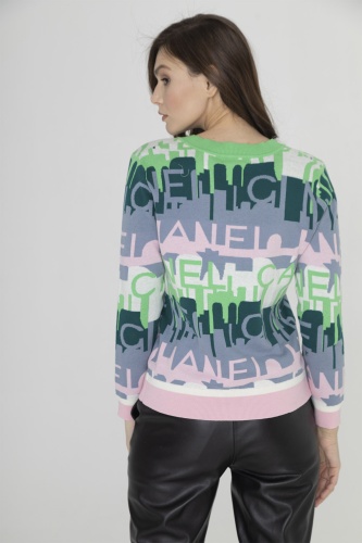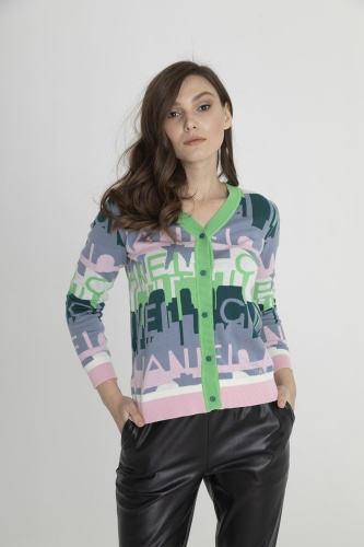 На сайте указаны российские размеры. Ткань: кардиган гладкий трикотажный из хлопка и акрила. Крой: слегка приталенный уютный кардиган с V-образным вырезом идеально садится по фигуре и подчеркивает ее достоинства. Длинный рукав с манжетом-резинкой можно подворачивать до желаемого уровня. Средняя длина надежно скрывает область живота, а вязка-резинка в нижней части изделия не позволяет ему подниматься при ходьбе и движении. Отделка: яркий принт с буквами создает особое настроение. Планка с контрастными пуговицами повторяет фактуру манжетов и низа изделия, что добавляет гармонии всему образу. Украшен фирменной металлической эмблемой-шильдиком в передней нижней части. К яркому верху лучше подбирать более спокойный однотонный низ из коллекции одежды Stern.