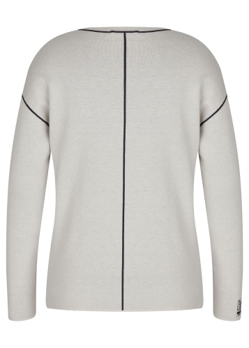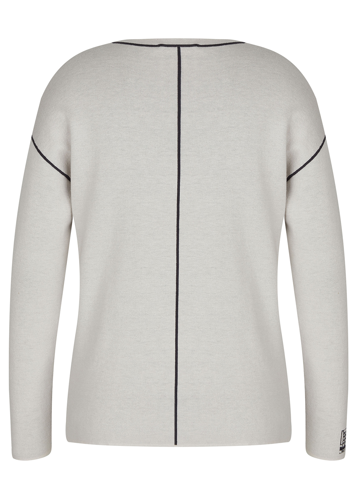 Трикотажный джемпер с буквенным принтом. Втачной рукав полной длины со спущенной линией плеча. Декоративные контрастные строчки на спинке и рукавах изделия. Овальный вырез горловины.