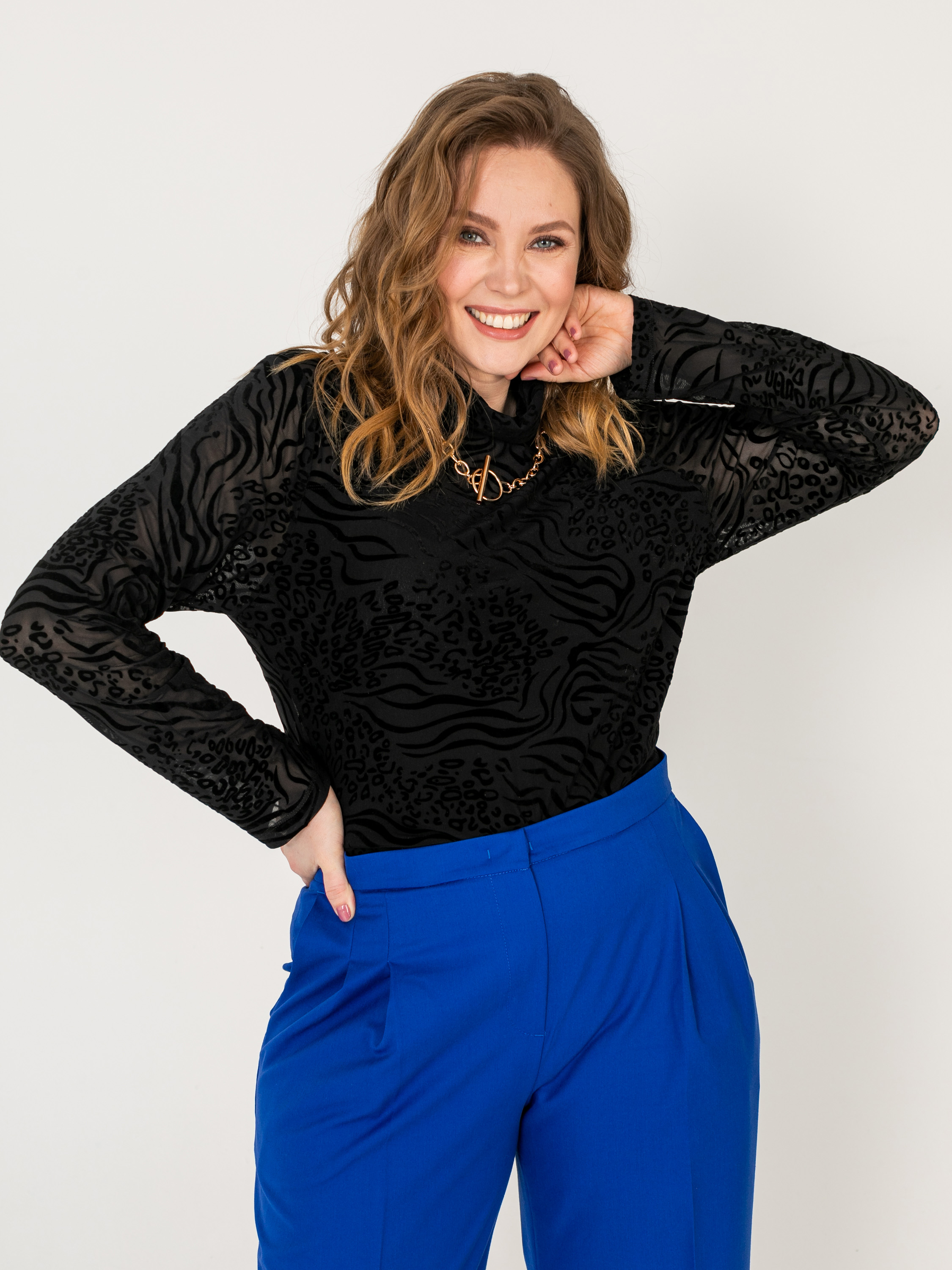 На сайте указаны российские размеры. Ткань: водолазка выполнена из легкого, струящегося нейлона, который так же приятен телу, как шелк. Эластан в составе обеспечивает небольшое растяжение. Крой: слегка приталенный силуэт подчеркивает красоту изгибов женского тела. Передняя часть изделия имеет подклад, задняя часть и рукава – без него, что позволяет показать изысканность ажурного материала. Высоту горла водолазки можно регулировать подгибом. Отделка: в основе стильного ажурного рисунка на ткани лежат животные мотивы, которые выглядят уместно и торжественно. Насыщенный черный цвет водолазки дает возможности для создания как повседневных, так и вечерних образов. Сочетайте блузку с контрастными брюками, юбками-карандаш и жакетами из коллекции Stern.