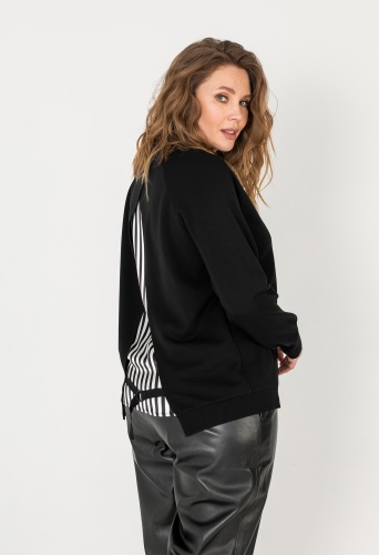 На сайте указаны российские размеры. Состав: смесовая ткань средней плотности. В составе: 30% хлопок, 65% вискоза, 5% эластан. Отделка: 96% полиэстер, 4% эластан. Крой: лаконичный джемпер прямого силуэта с длинным рукавом и круглым вырезом. Идеально садится по фигуре, скрывая недостатки, а насыщенный черный цвет визуально делает образ еще стройнее. Отделка: спинка джемпера украшена декоративной вставкой из гладкой ткани, детали основного материалы соединяются перемычкой в цвет. Обратите внимание на коллекцию кожаных брюк в соответствующем разделе нашего сайта. Они идеально подходят к этому джемперу.