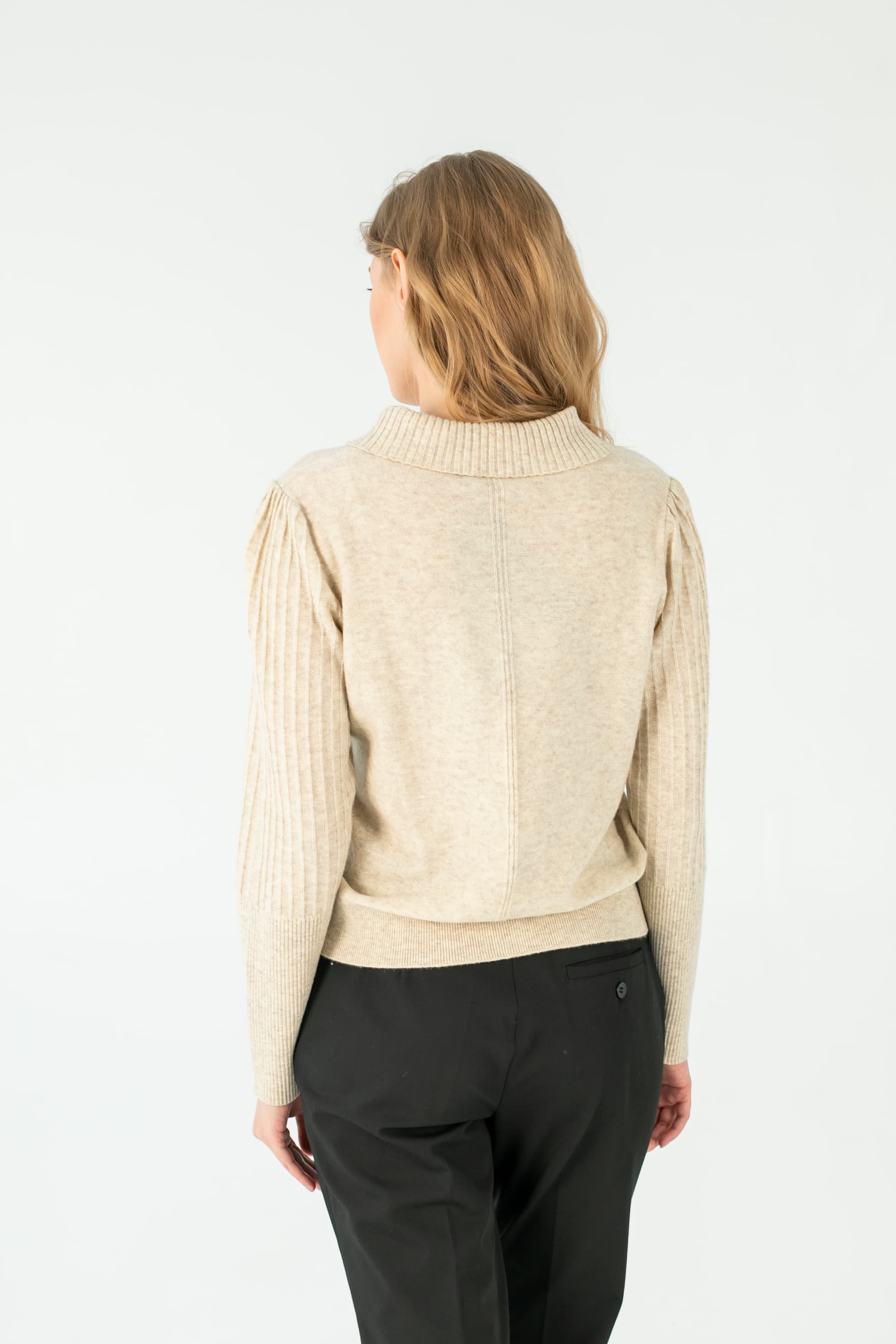 На сайте указаны российские размеры. Крой: джемпер прямого силуэта с длинным рукавом. Шерсть в составе дарит непревзойденное тепло, материал приятен телу, не колется и не натирает. Универсальная модель отличается простым, но удобным кроем и идеальной посадкой на женщин разного роста и комплекций. Представлен в двух сдержанных оттенках – сером и бежевом. Отделка: аккуратный треугольный воротничок добавляет истинного благородства и аристократизма этому джемперу. Фактурная полоса по центру изделия создает дополнительную вертикаль, которая гармонирует с рубчиком на рукавах. Подберите идеальный низ в разделах юбок и брюк на сайте Stern.