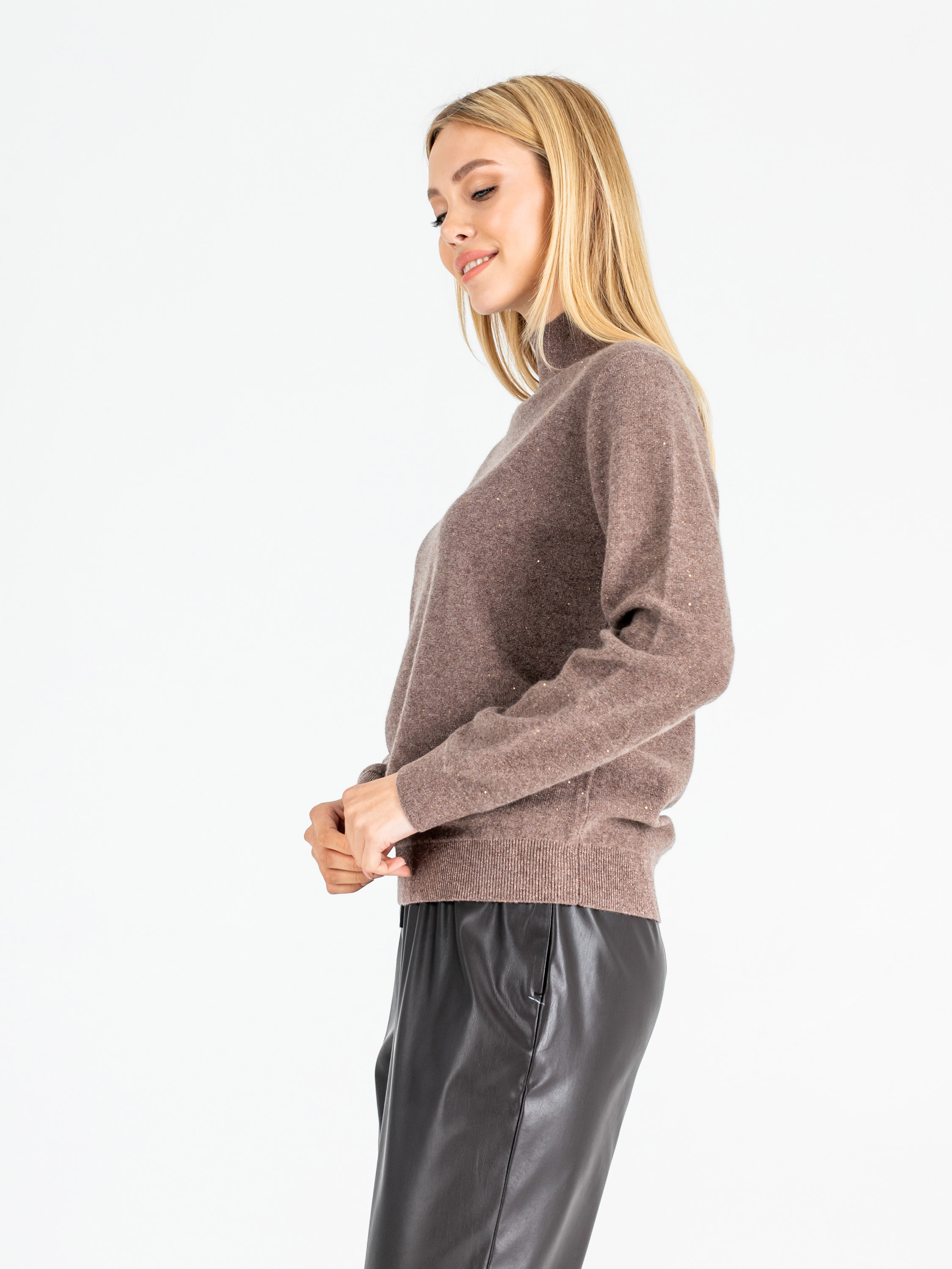 На сайте указаны Российские размеры. Ткань: 98% шерсть мериноса, 2% полиакрил. Крой: базовый однотонный джемпер приталенного силуэта. Модель, напоминающая привычную водолазку, выделяется длинным воротом-резинкой, который защищает от холода и ветра. Универсальная модель из шерсти мериноса – идеальный вариант для зимы и межсезонья. Джемпер представлен в двух стильных цветах – черном и коричневом. Отделка: легкое благородное сияние ткани придают прозрачные пайетки. Базовый компаньон для джинсов, брюк, джемперов, сарафанов, юбок и рубашек. Рост модели - 177 см