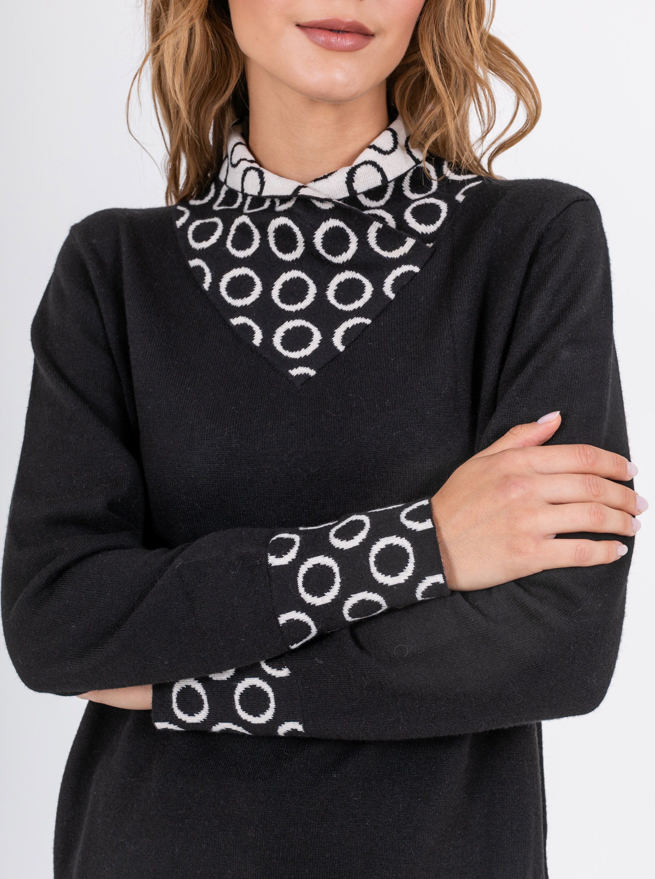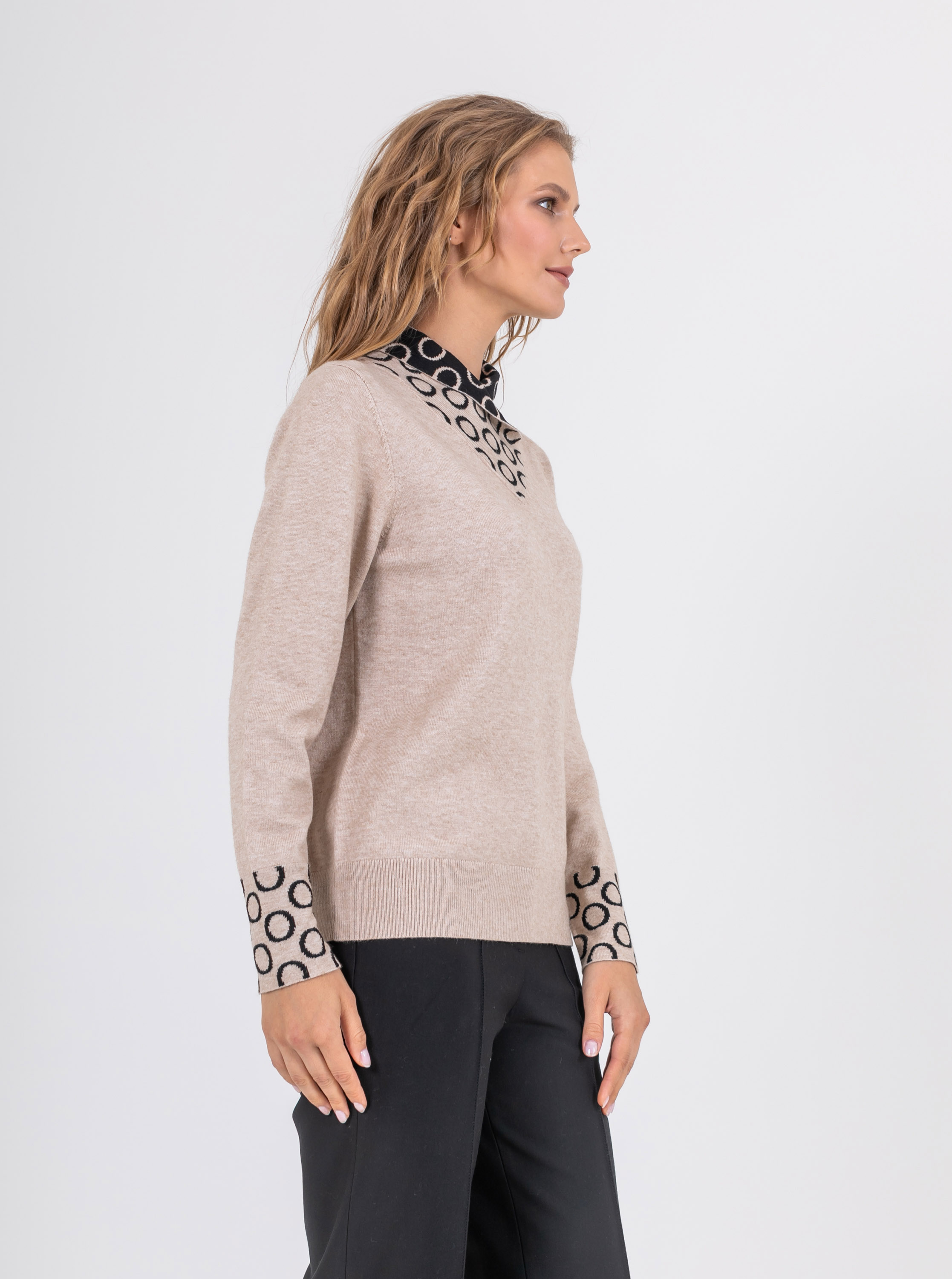 На сайте указаны российские размеры. Ткань: выполнен из качественного гладкого трикотажа. В составе 6% шерсть,10% нейлон, 59% полиэстер, 10% вискоза. Крой: слегка приталенный джемпер из гладкого трикотажа средней плотности. Женственная, подчеркивающая все достоинства фигуры модель создает гармоничный и спокойный образ, который захотят повторить. Оригинальный ворот выделяется своей необычной конструкцией и подчеркивает красоту шеи. Длинные, чуть свободные рукава с манжетом-резинкой, не сковывают движения, дарят комфорт и тело. Джемпер представлен в двух стильных цветах – черном и бежевом. Отделка: двусторонний ворот, сложенный изящным уголком, поражает воображение: контраст двух цветов, усиленный узором «круги», делает образ запоминающимся и на 100% стильным. Цветовое решение поддерживают и рукава с тем же принтом. Сочетайте с однотонными вещами из коллекции Stern, чтобы не смещать фокус внимания с красивой отделки джемпера. Рост модели: 174 см Длина по спинке: 60 см