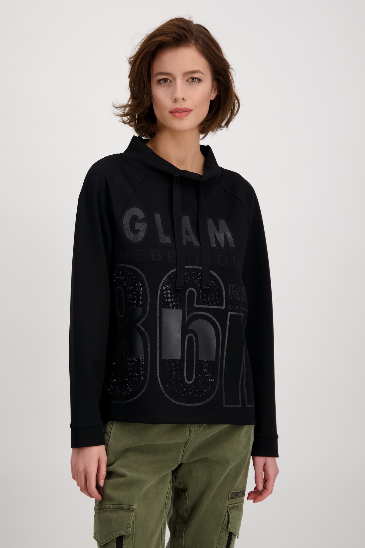 На сайте указаны российские размеры. Толстовка с воротником-стойкой и стразами. В толстовке с длинными рукавами от monari вы почувствуете удобную посадку. Благодаря красивой надписи с эффектными деталями из сверкающих стразов, блесток и лакового принта спереди модели удается стильно привлекать внимание. Стандартный крой поставляется с воротником-стойкой с кулиской, люверсами и завязками. Модель ростом 178 см.