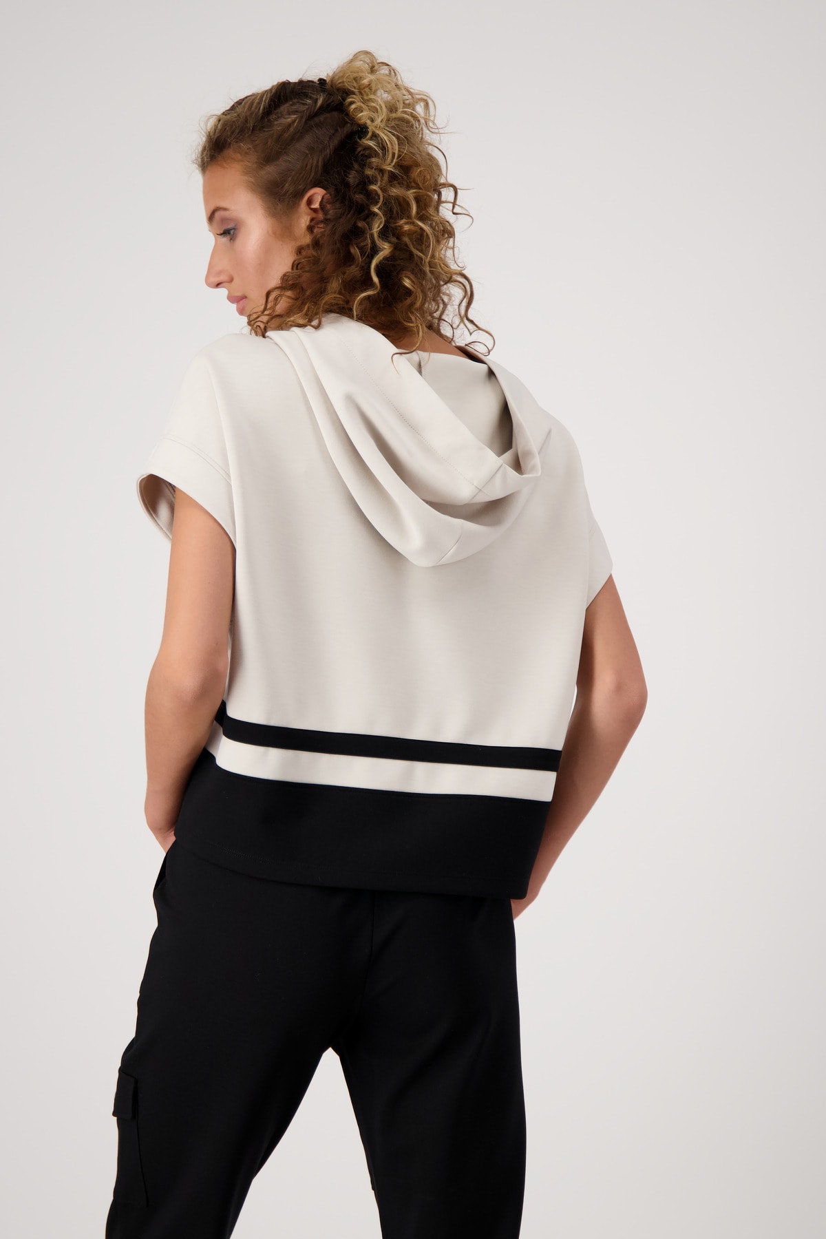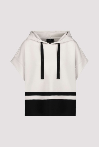 На сайте указаны российские размеры. Толстовка с капюшоном в стиле колор-блок. Комбинезон прямого кроя, капюшон с разделительным швом, кулиской, люверсами в виде колец и завязкой со сверкающими стразами, а также намеком на короткий рукав внахлест. Концы рукавов дополнены широкими манжетами. Модель ростом 176 см.
