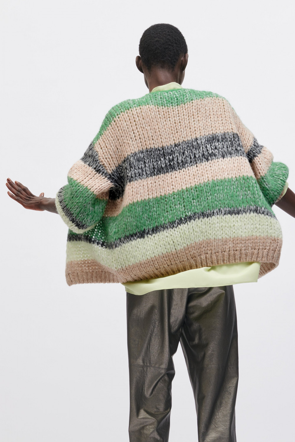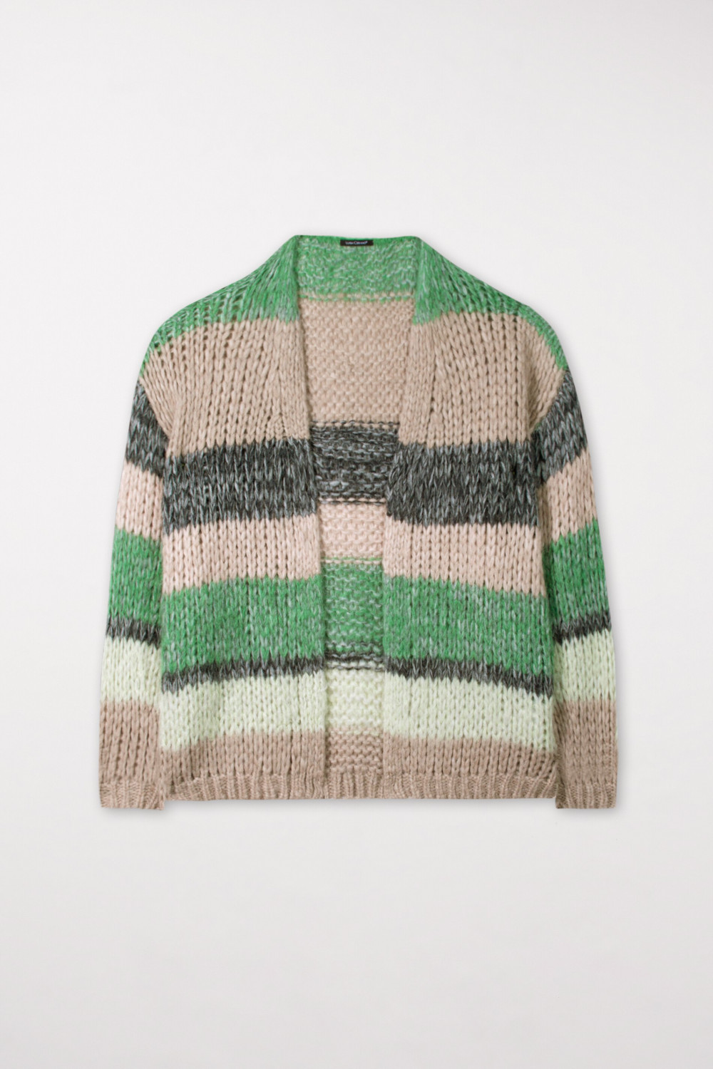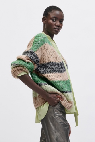 На сайте указаны российские размеры. Открытый кардиган из высококачественной итальянской смесовой шерсти с эффектом крапинки и узором в полоску. Повседневный крой дополнительно подчеркивается грубой вязкой. Модель ростом 178 см