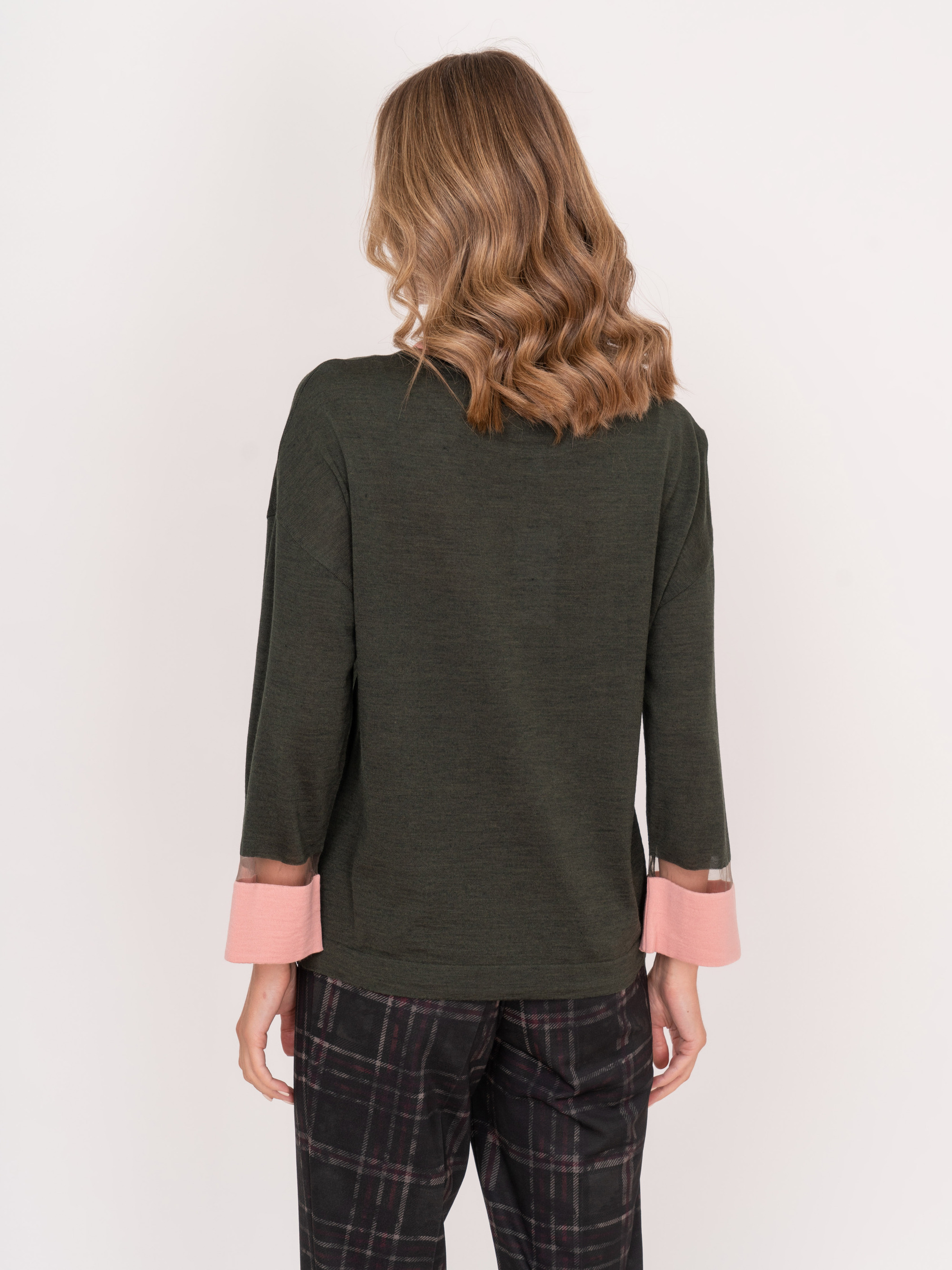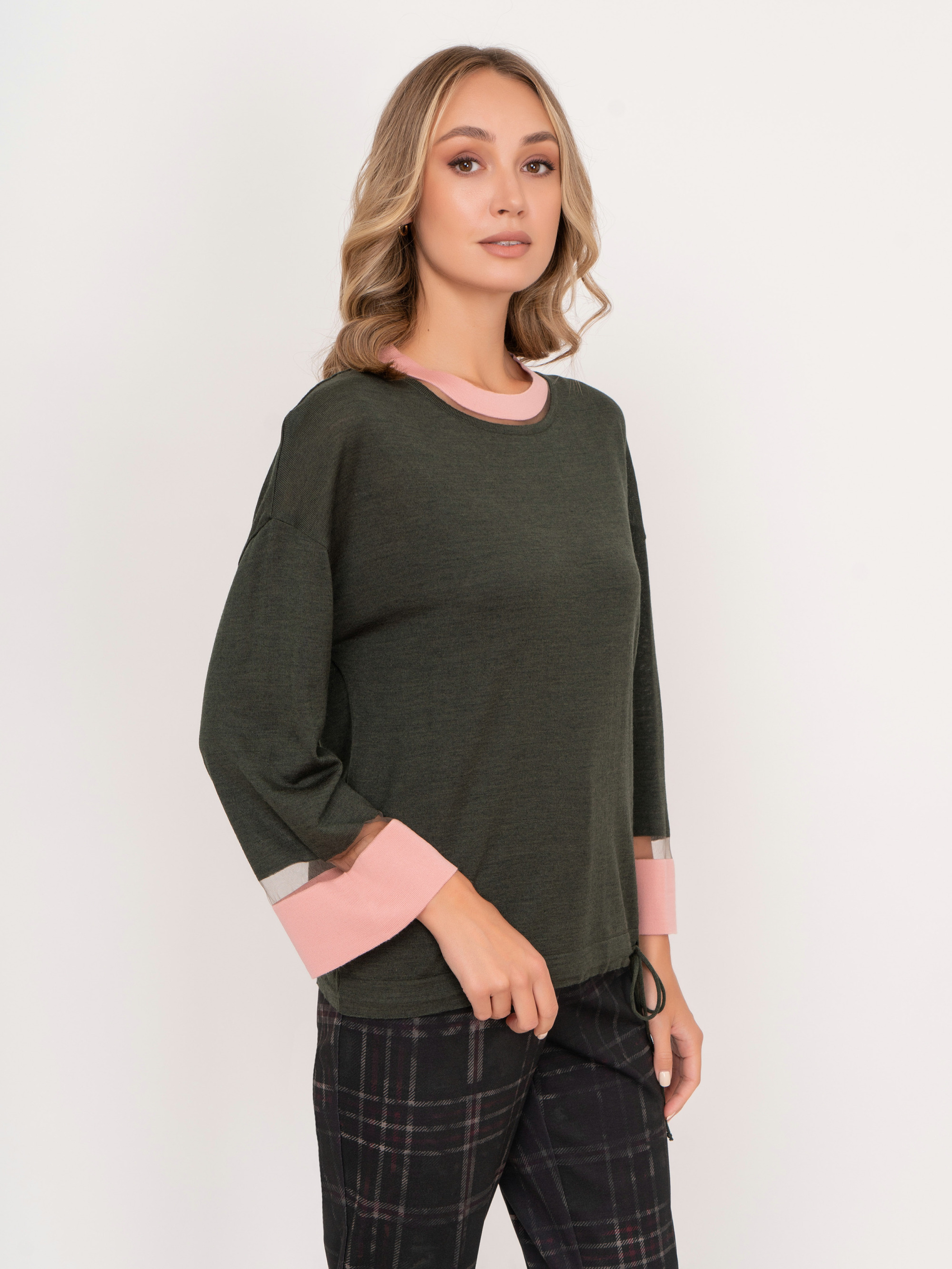 На сайте указаны российские размеры. Прямой трикотажный хаки джемпер с круглым вырезом, с длинным рукавом 7/8, с кулиской понизу, с розовыми и прозрачными вставками по горловине и на рукавах. Рост модели: 175 см. Длина джемпера: 56 см.