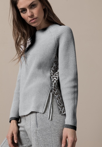 На сайте указаны российские размеры. Свитер крупной вязки с животным принтом сбоку. Высококачественная хлопковая смесь для удобной посадки. Боковая молния и контрастный низ рукавов. Круглый вырез, прямой крой, слегка удлиненная спинка. Длина джемпера в 44 размере - 62 см.
