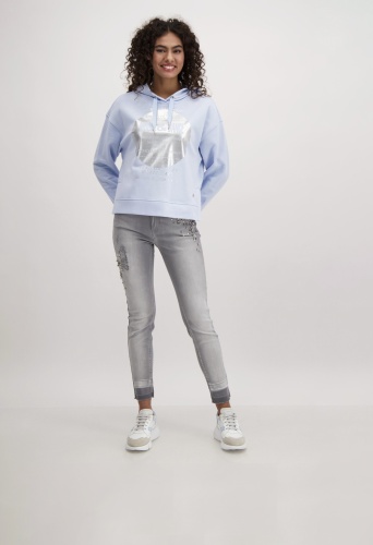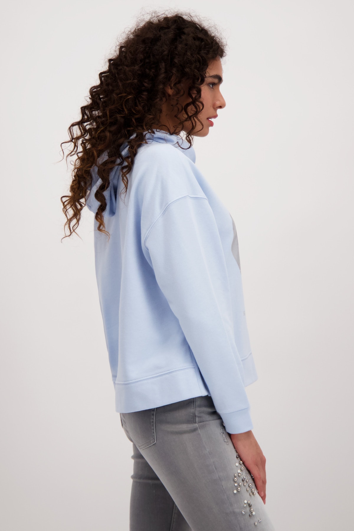 На сайте указаны российские размеры. Толстовка с длинными рукавами от monari позволяет легко создавать новые стили. Длинные рукава и подол заканчиваются широкими манжетами, а длинные боковые разрезы оснащены панелями. Форма: прямой крой, крутой капюшон с кулиской, люверсами и лентой для завязывания, широкие плечи. Передняя часть становится изюминкой благодаря большой блестящей лакированной буквенной эмблеме. Благодаря высококачественному хлопковому смесовому материалу толстовка проста в уходе и приятна на ощупь. Модель ростом 178 см. Длина спины 44 размера 60 см.