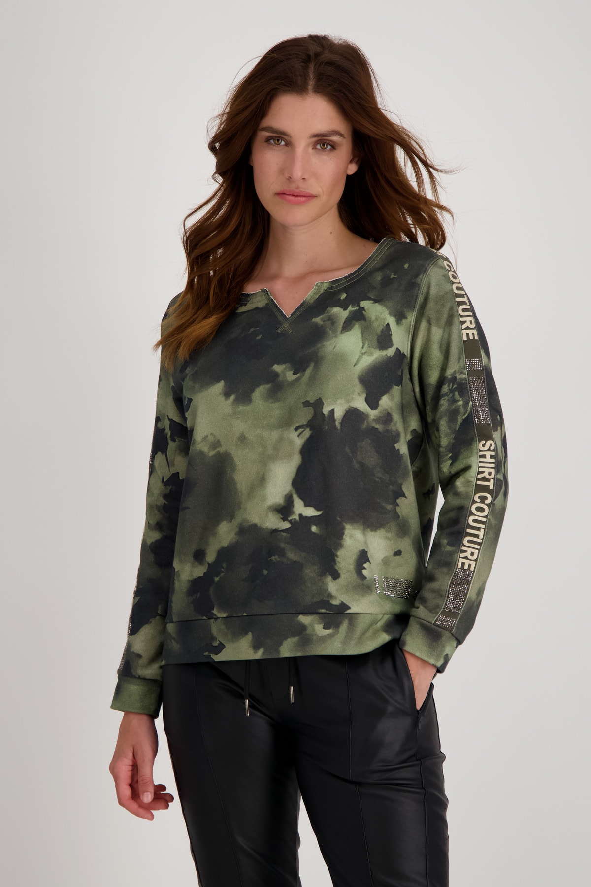 На сайте указаны российские размеры. Толстовка с круглым вырезом с принтом под батик и стразами. Модель с двусторонней молнией легко расстегивается и закрывается, а передняя часть модели с воротником-стойкой дополнена двумя прорезными карманами на молнии и прорезным карманом на уровне груди. Подол легко регулируется благодаря кулиске с резинками и стопорами шнура. Модель ростом 175 см. Длина спины 44 размера 64 см, а по переду - 62 см.