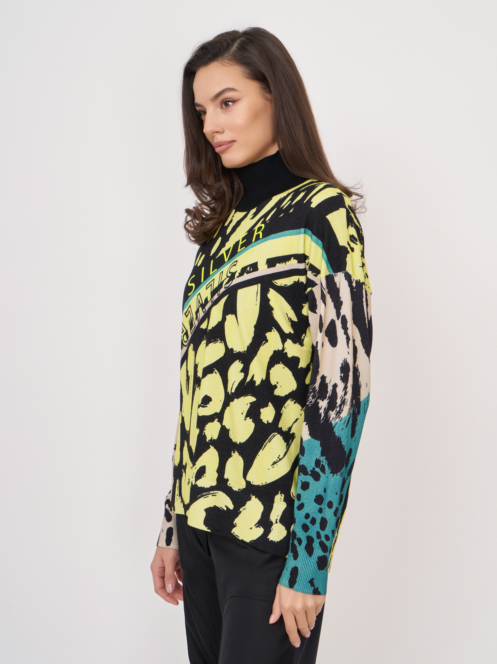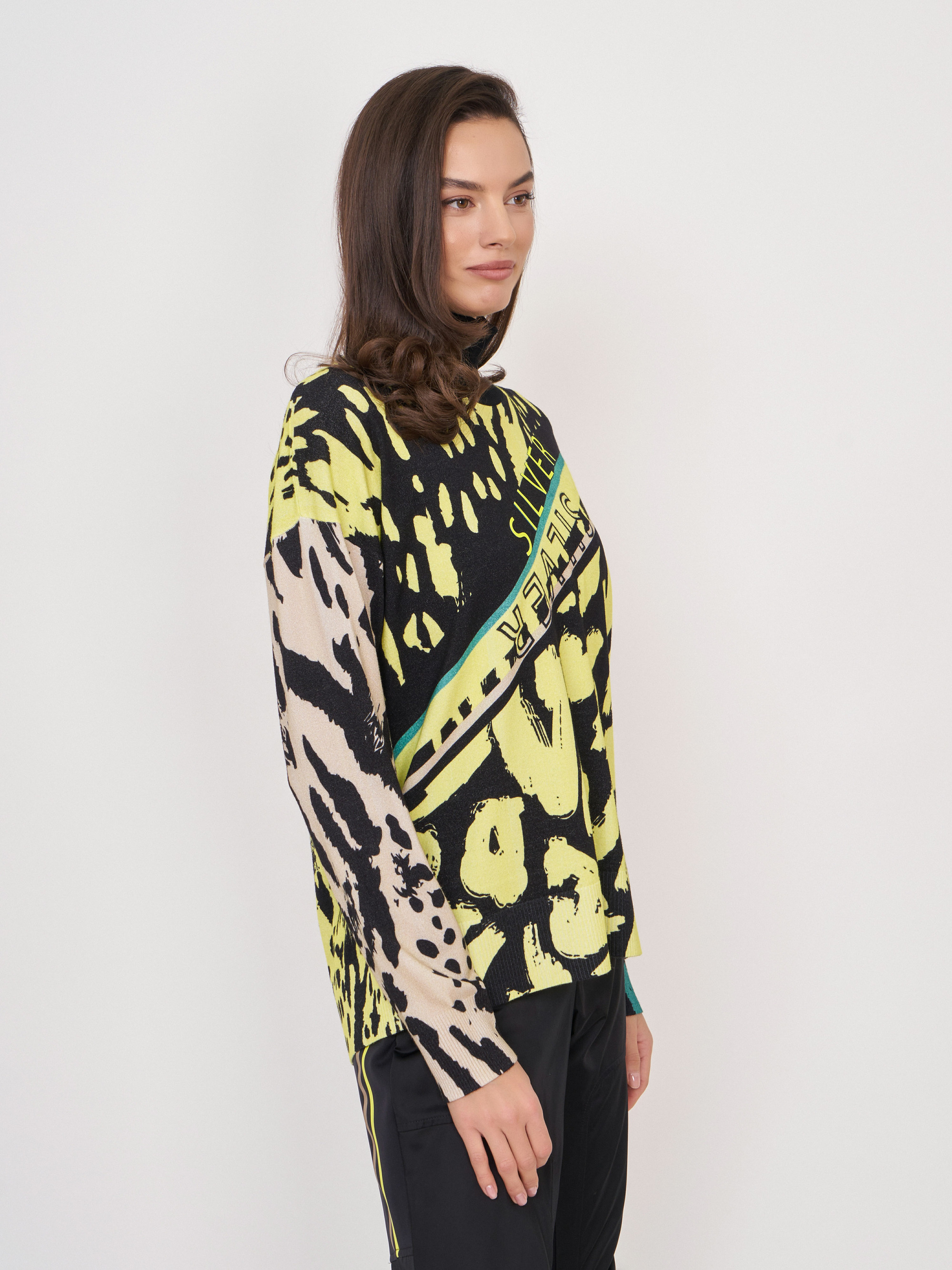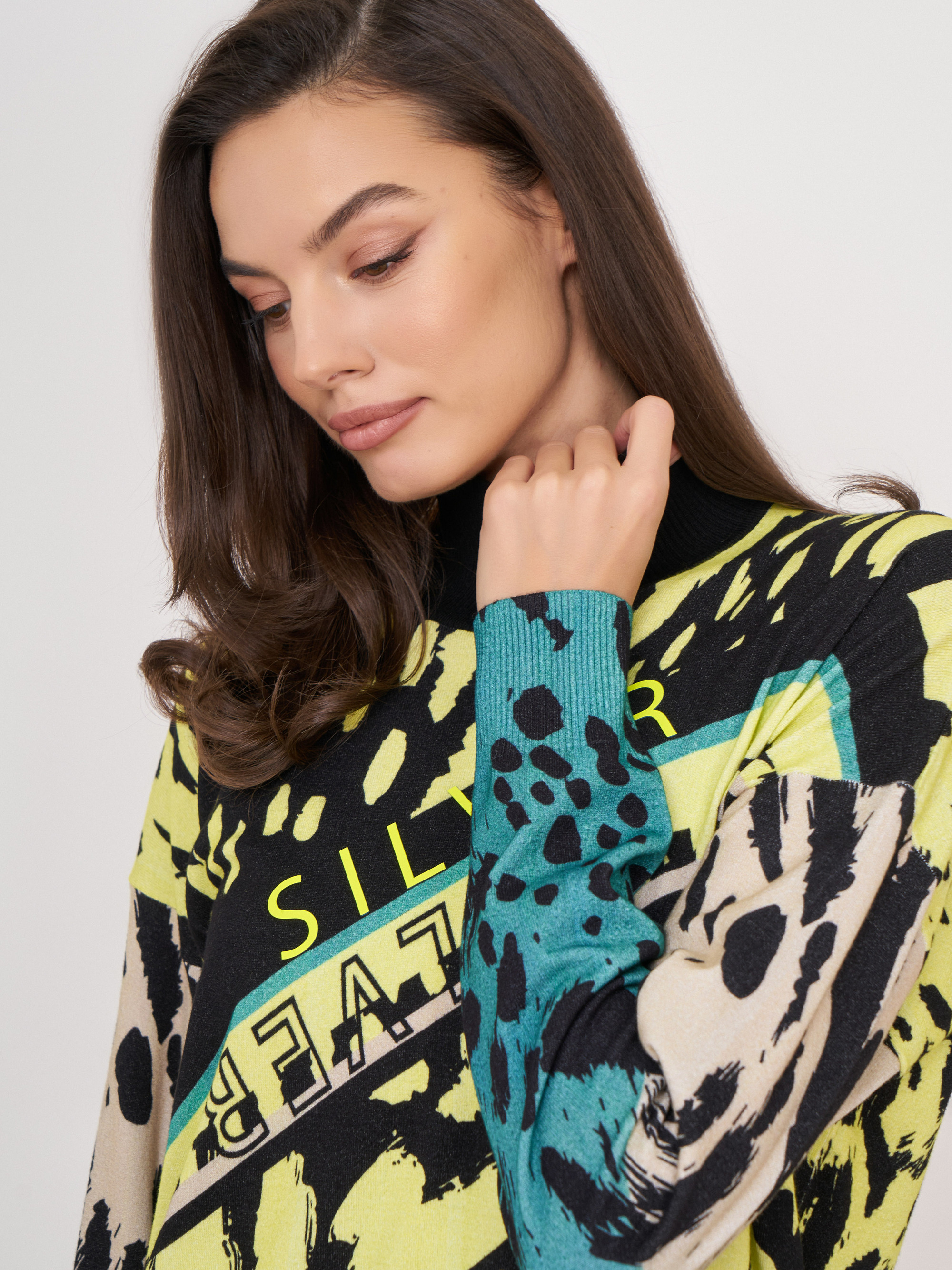 На сайте указаны российские размеры. Прямой трикотажный черно-салатовый свитер, с воротником-стойка, с длинным рукавом, с абстрактным рисунком, с бежевыми и зелеными вставками, с надписями. Длина по спинке: 66 см. Рост модели: 175 см.