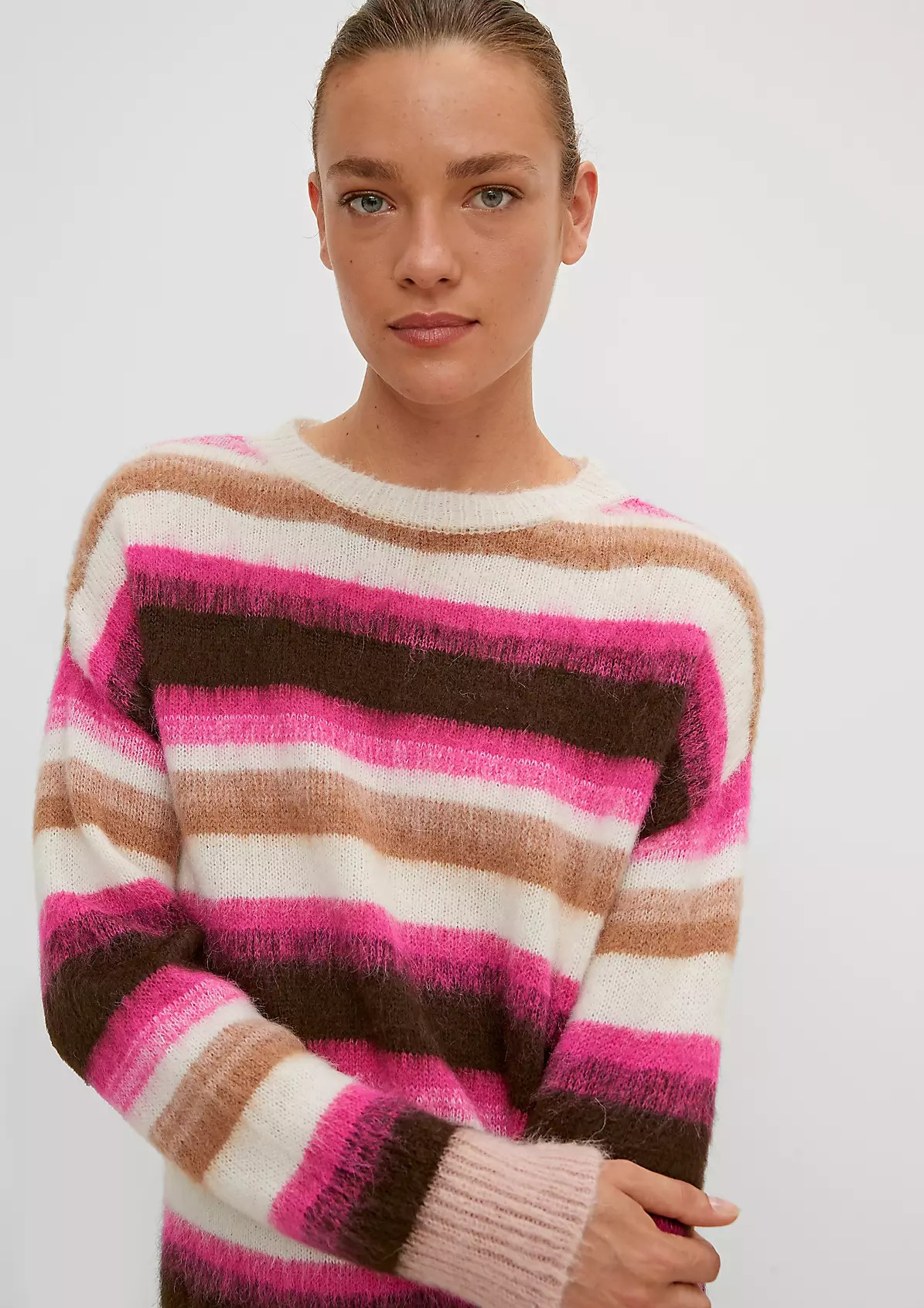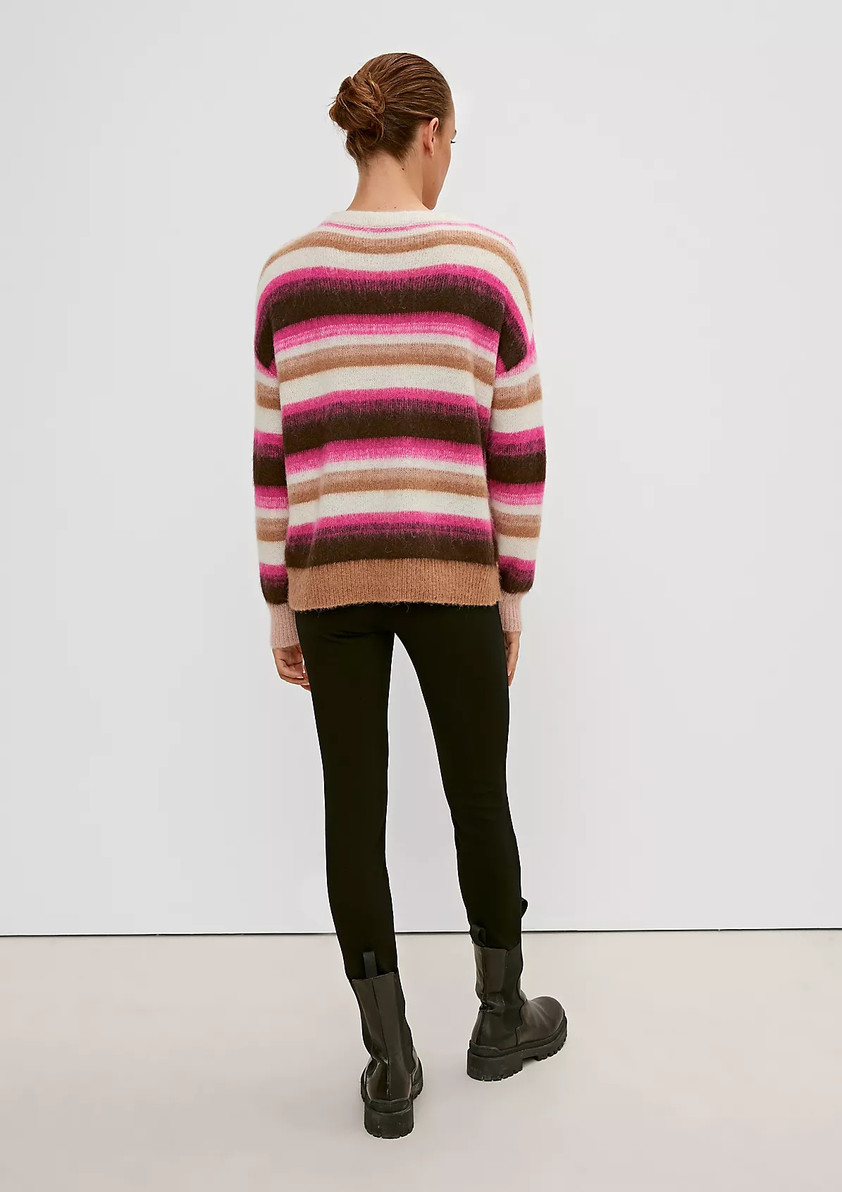 На сайте указаны российские размеры. Вязаный джемпер с полосками градуированного цвета. Круглый вырез горловины. Длинные рукава с манжетами в рубчик, заниженная линия плеча. Подол с ребристой отделкой. Длина спины 64 см в размере 42.