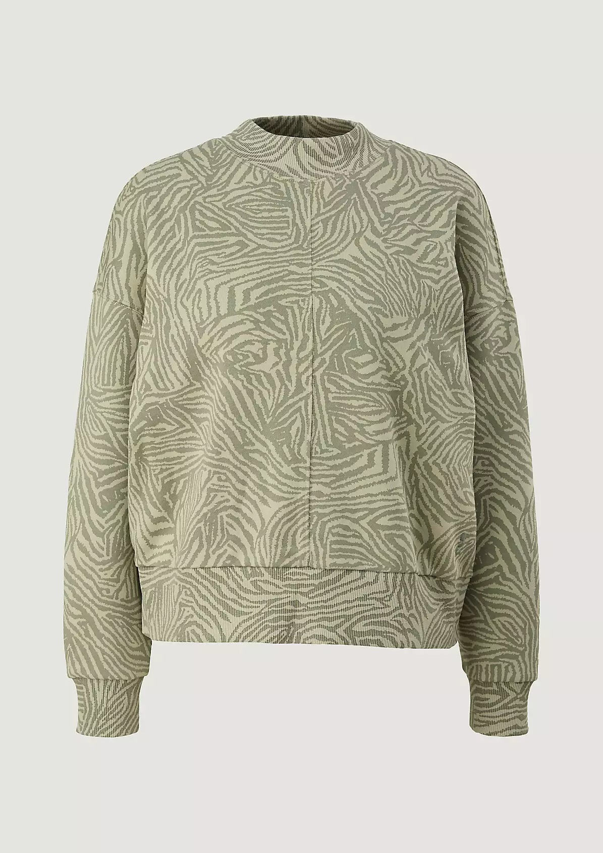 На сайте указаны российские размеры. Укороченный джемпер из мягкой ткани с анималистичным принтом. Круглый вырез горловины с отделкой в рубчик. Длинные рукава с ребристыми манжетами. Эластичный низ, с отделкой в рубчик. Длина спины: 56 см в размере 42. Рост модели 176 см.