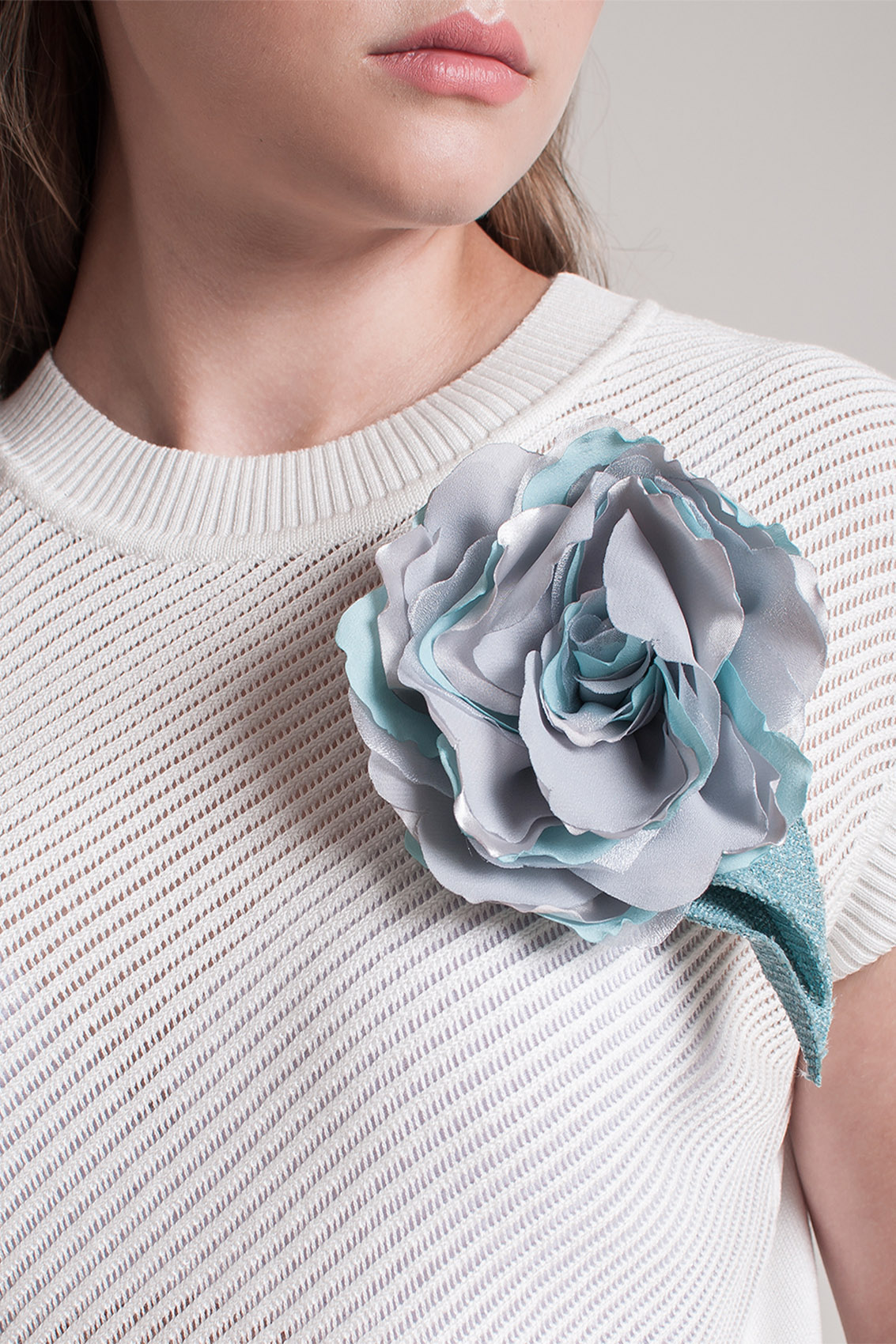Джемпер прямого кроя. Круглый вырез горловины, короткие цельнокроеные рукава. Перед изделия выполнен ажурной машинной вязкой. Украшение в виде цветка.