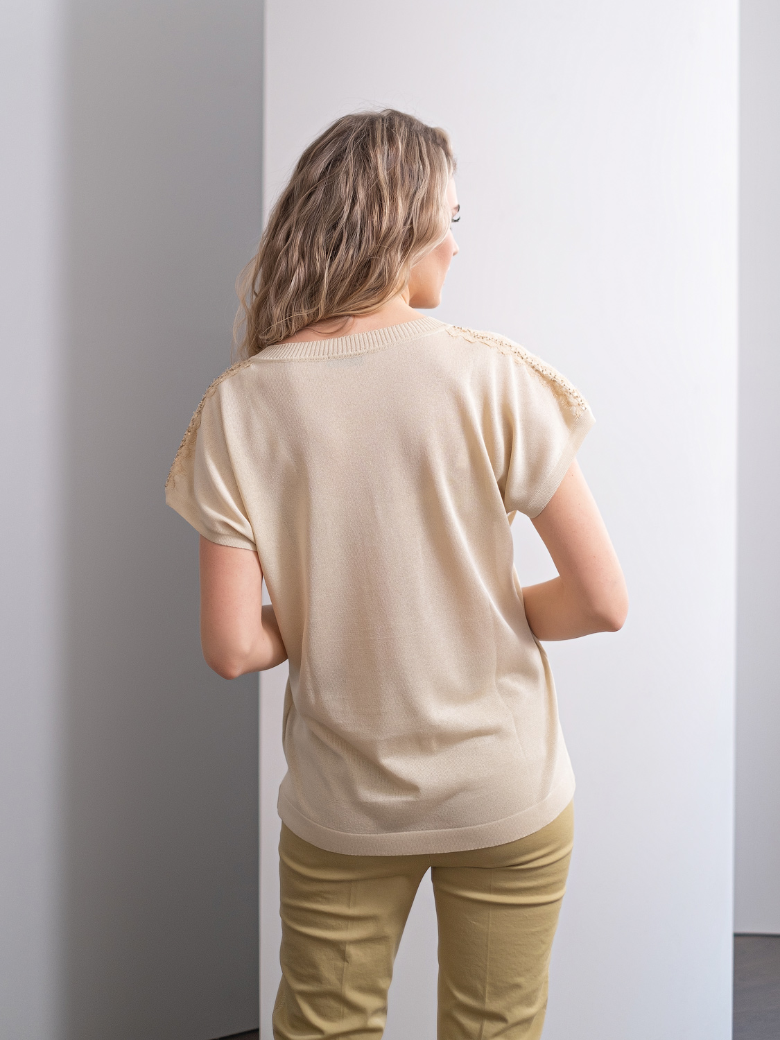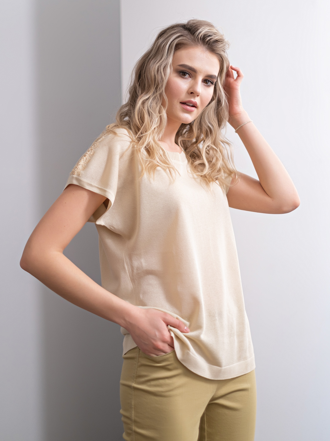 Однотонный джемпер в нюдовом оттенке – базовая вещь капсульного гардероба любой современной женщины. Джемпер идеально сочетается с различными комплектами одежды, может выступать как самостоятельный верх или надеваться под жакет.Короткий цельнокроеный рукав оголяет руки и визуально стройнит силуэт. Кружевной декоративный элемент украшает линию плечевого шва. Круглый вырез горловины подчеркивает изящество линии шеи.
