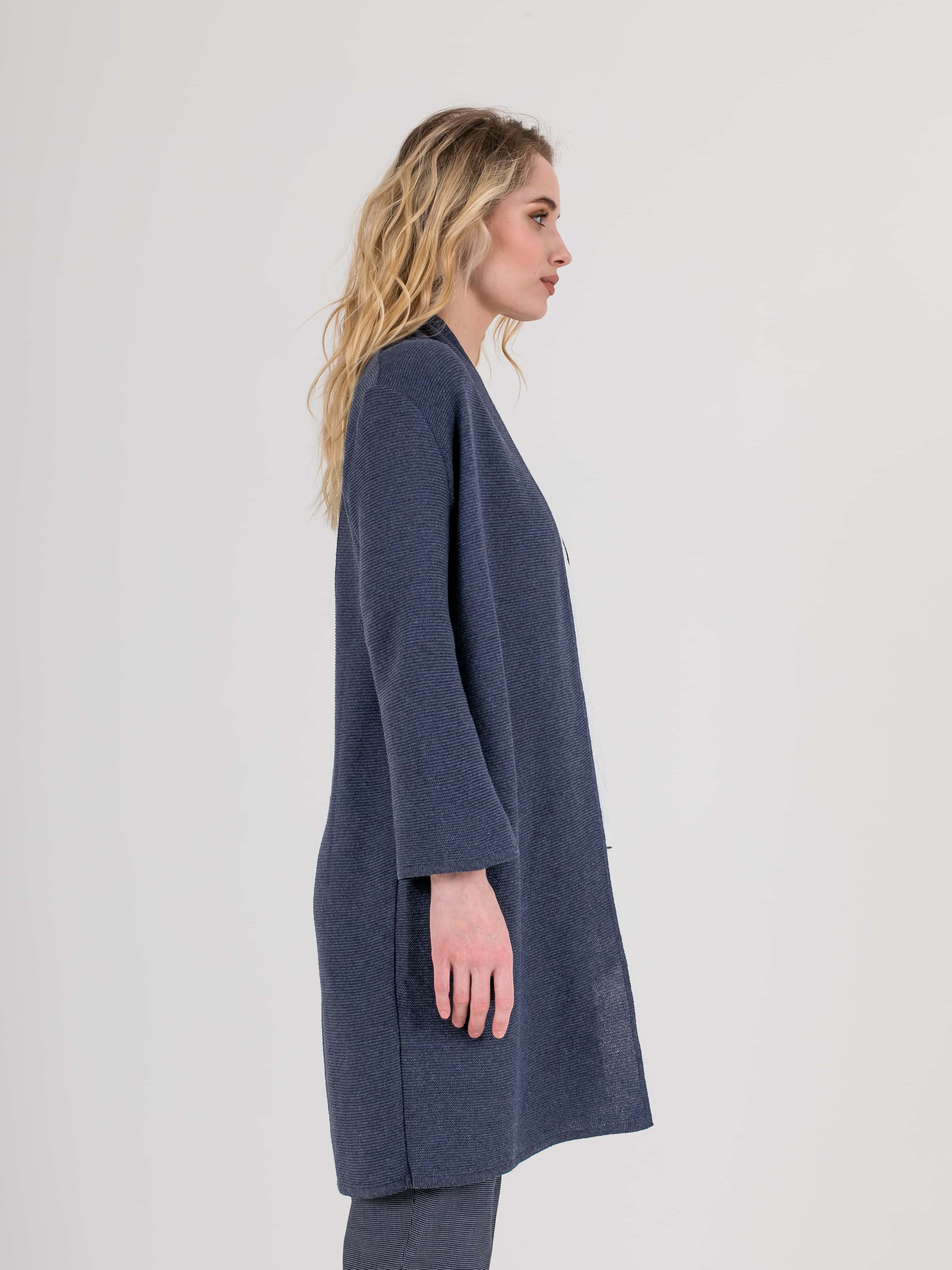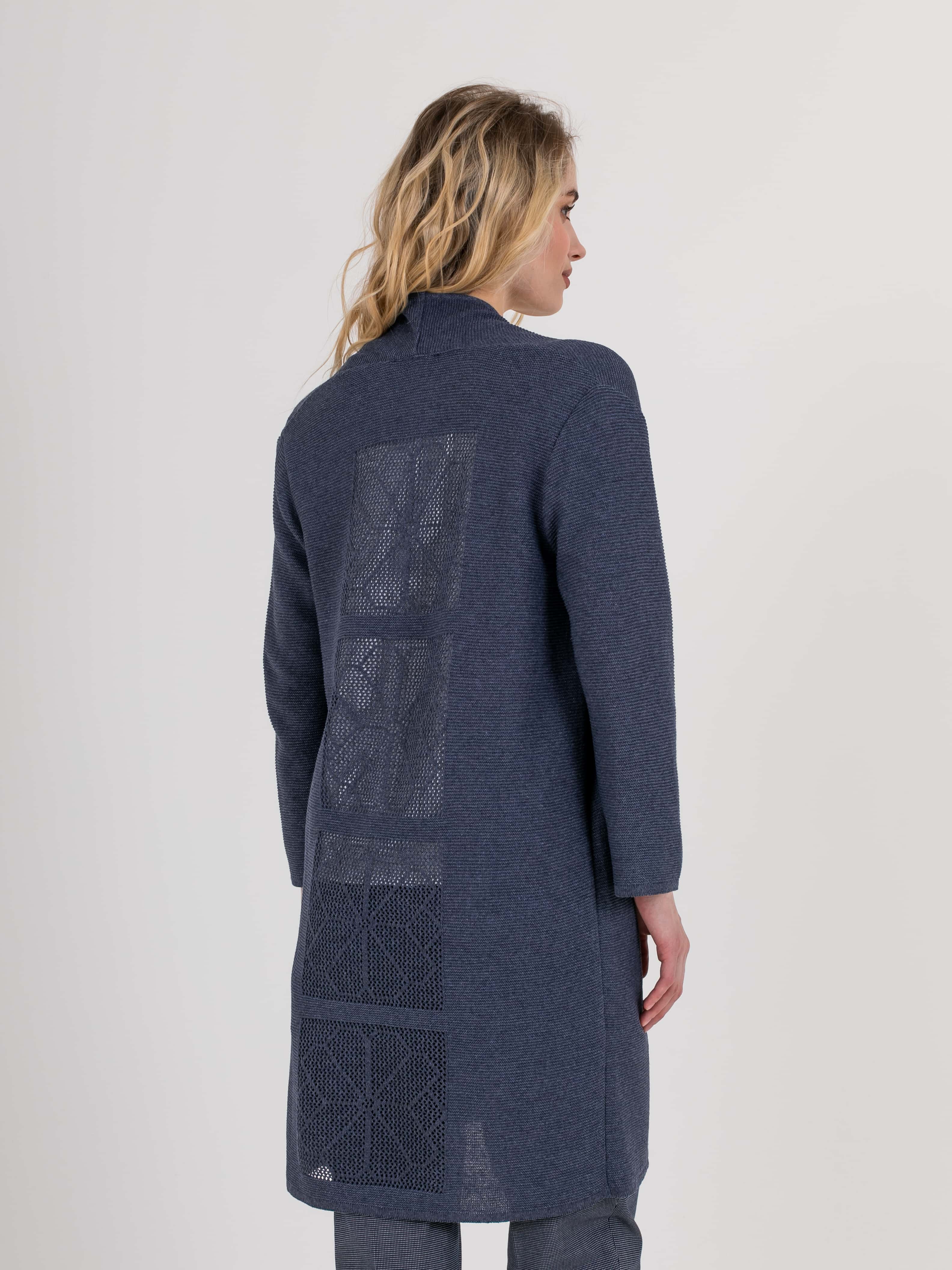 На сайте указаны российские размеры. Кардиган прямого силуэта длиной до середины бедер, из легкого хлопка с добавлением полиакрилонитрила. На спинке выполнен эффектный геометрический узор. Длинные втачные рукава со спущенной линией плеча. Горловина обработана небольшой стойкой.
