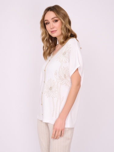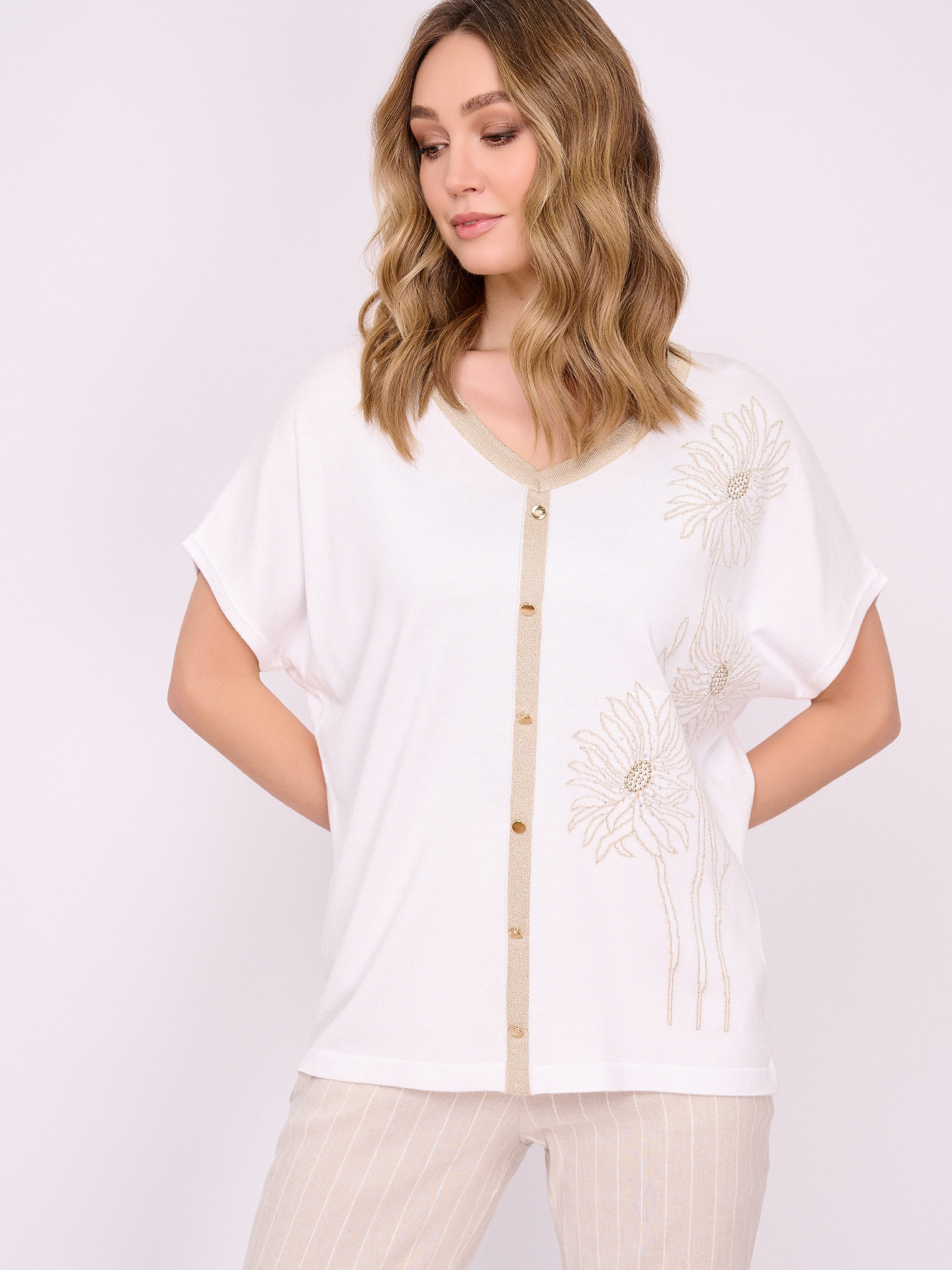 На сайте указаны российские размеры. Трикотажный прямой белый пуловер с V-образным вырезом, с коротким рукавом, с золотистыми вставками и с золотистым цветочным рисунком, с декоративными пуговицами и стразами. Длина по спинке: 63 см. Рост модели: 175 см.