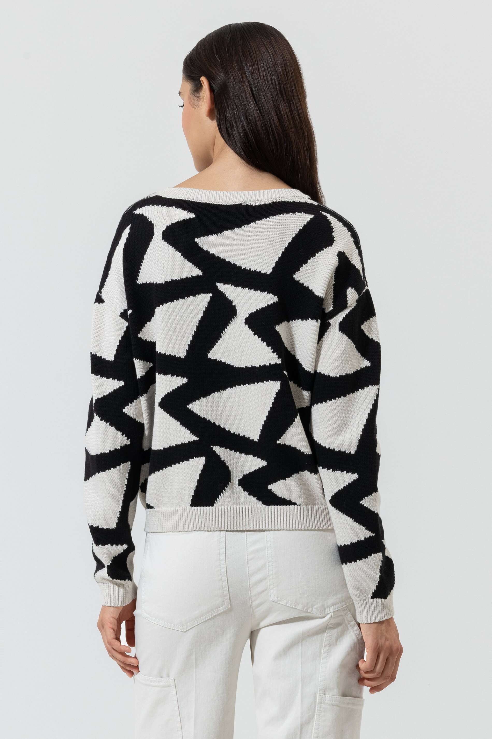 На сайте указаны российские размеры. Укороченный пуловер с круглым вырезом горловины в рубчик, манжетами и нижней каймой. Крупные узоры интарсии добавлены в легкую переплетенную хлопковую пряжу. Рост модели 178 см