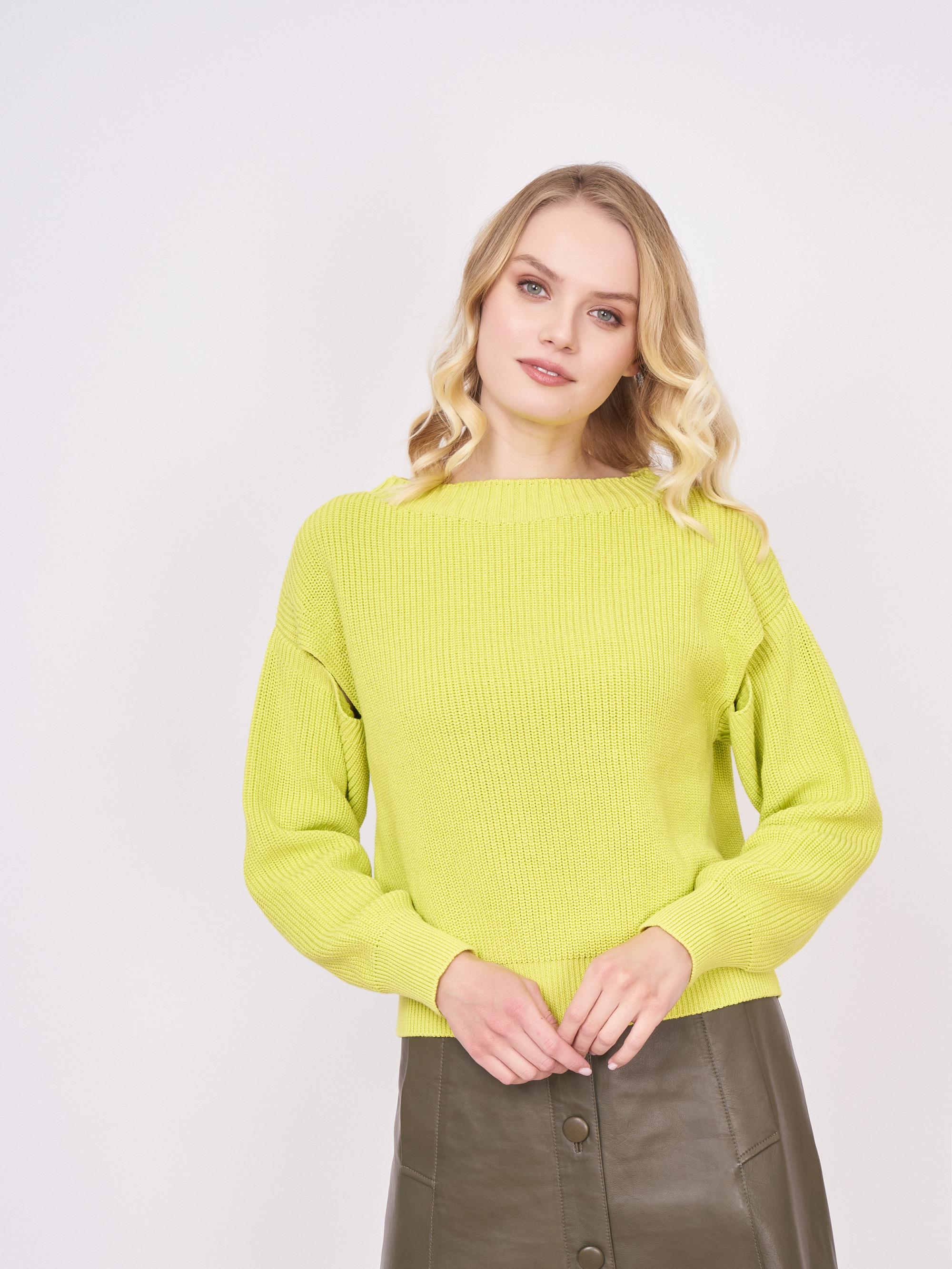 На сайте указаны российские размеры. Пуловер из органического хлопка с широким круглым вырезом идеально подходит для повседневной носки. Модная изюминка: модные вырезы на пышных рукавах. Базовый комбинируем с кожаной юбкой, лоферами и маленькой сумкой. Кстати, благоприятная для кожи хлопковая пряжа изготовлена из растений, не содержащих генной инженерии и пестицидов, в соответствии с идеей устойчивого развития. Длина по спинке: 48 см. Рост модели: 176 см.