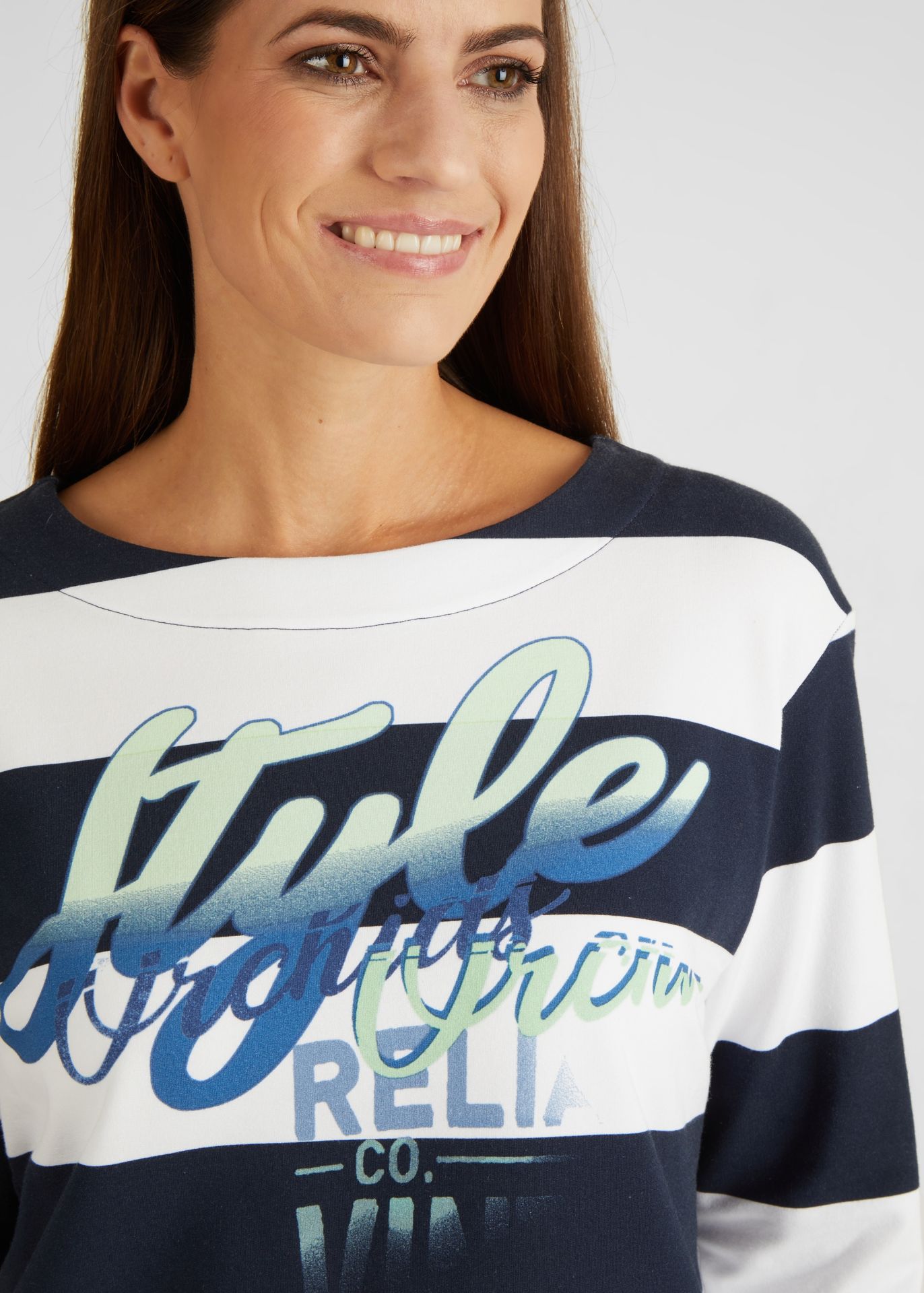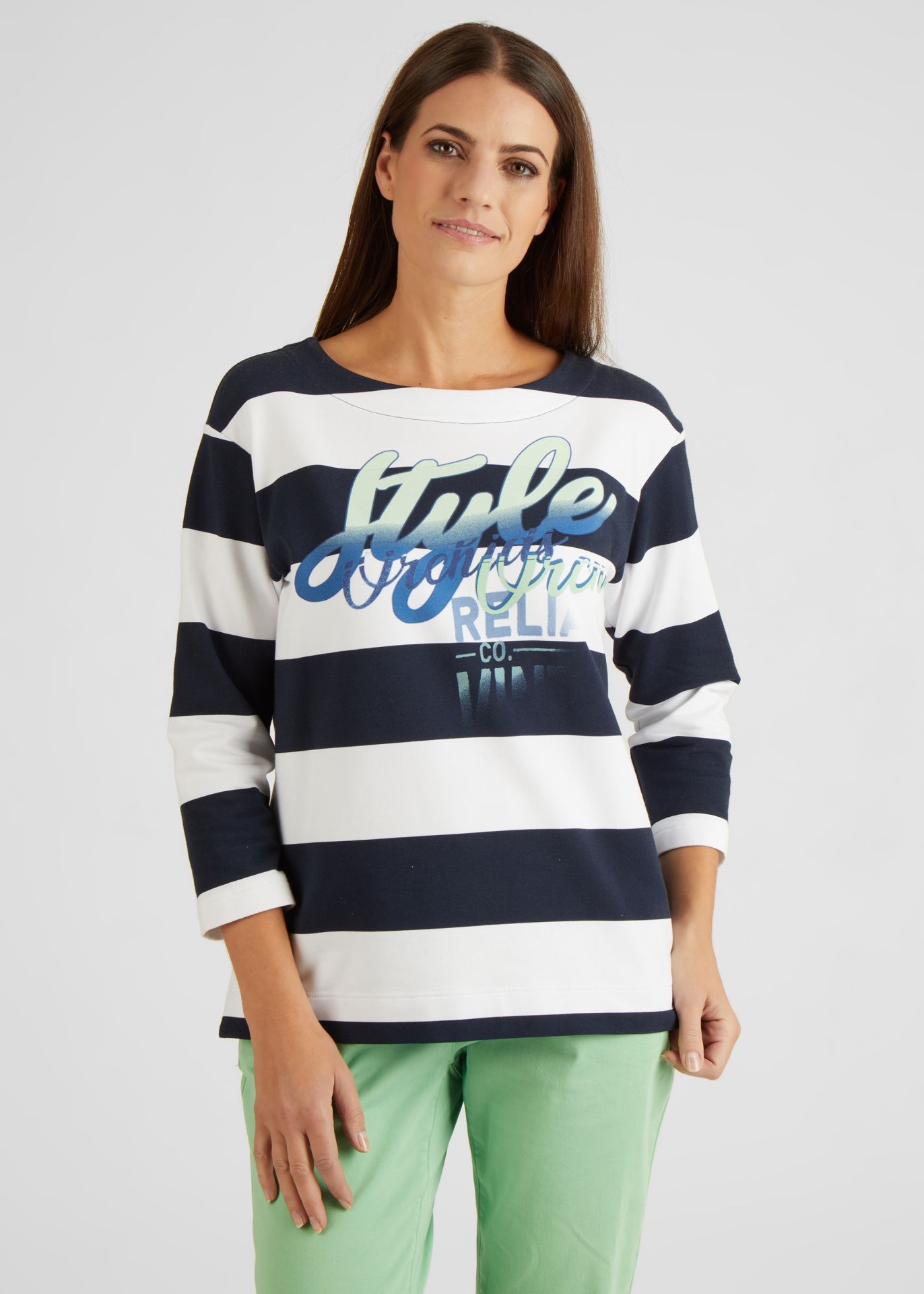 На сайте указаны российские размеры. Толстовка с круглым вырезом со стильной надписью может стать фаворитом. Прямой крой из мягкого трикотажно-хлопкового трикотажа приятно свободен в носке. Толстовка с полосатым рисунком и эффектной надписью создает стильный образ. Длина по спинке от плеча для размера 46: 64 см. Рост модели 176 см.