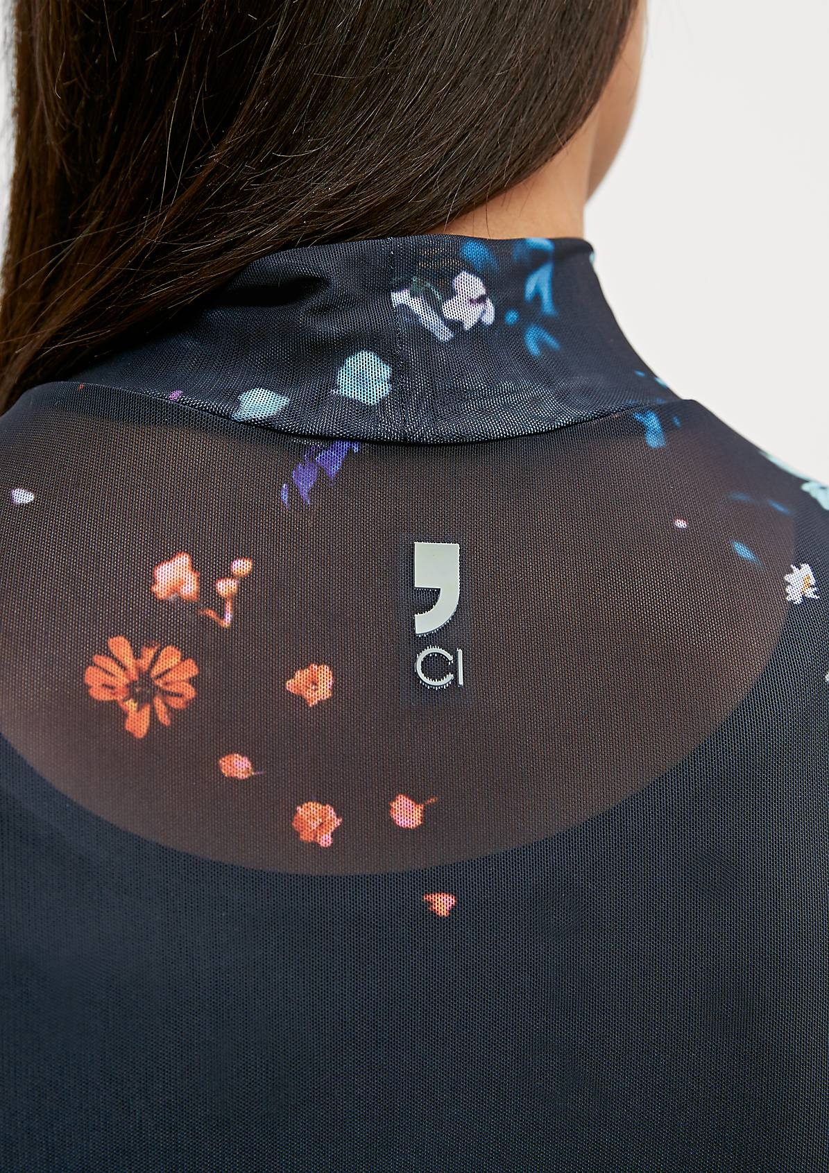 На сайте указаны российские размеры. Сетчатый топ со сплошным принтом. Длина спины 58 см в размере 42. Рост модели 177 см.