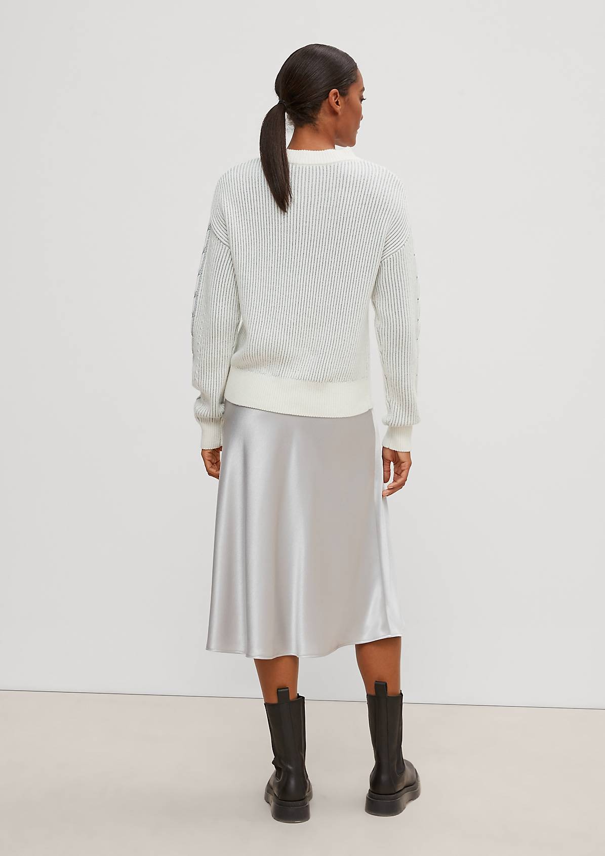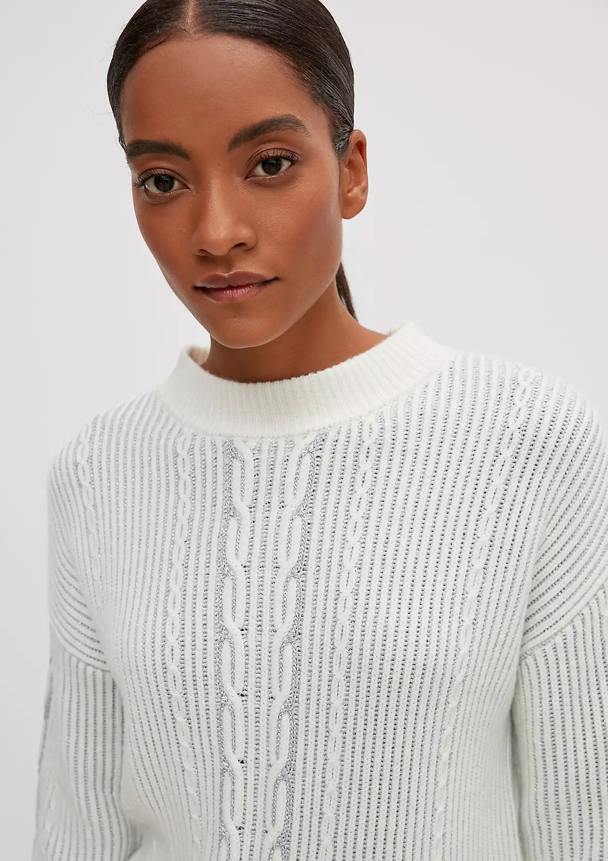 На сайте указаны российские размеры. Вязаный джемпер из смесовой шерсти. Длинные рукава, заниженная линия плеча. Детали: блестящая пряжа, узор спицами. Длина спины 57 см в размере 42 Рост модели 178 см.